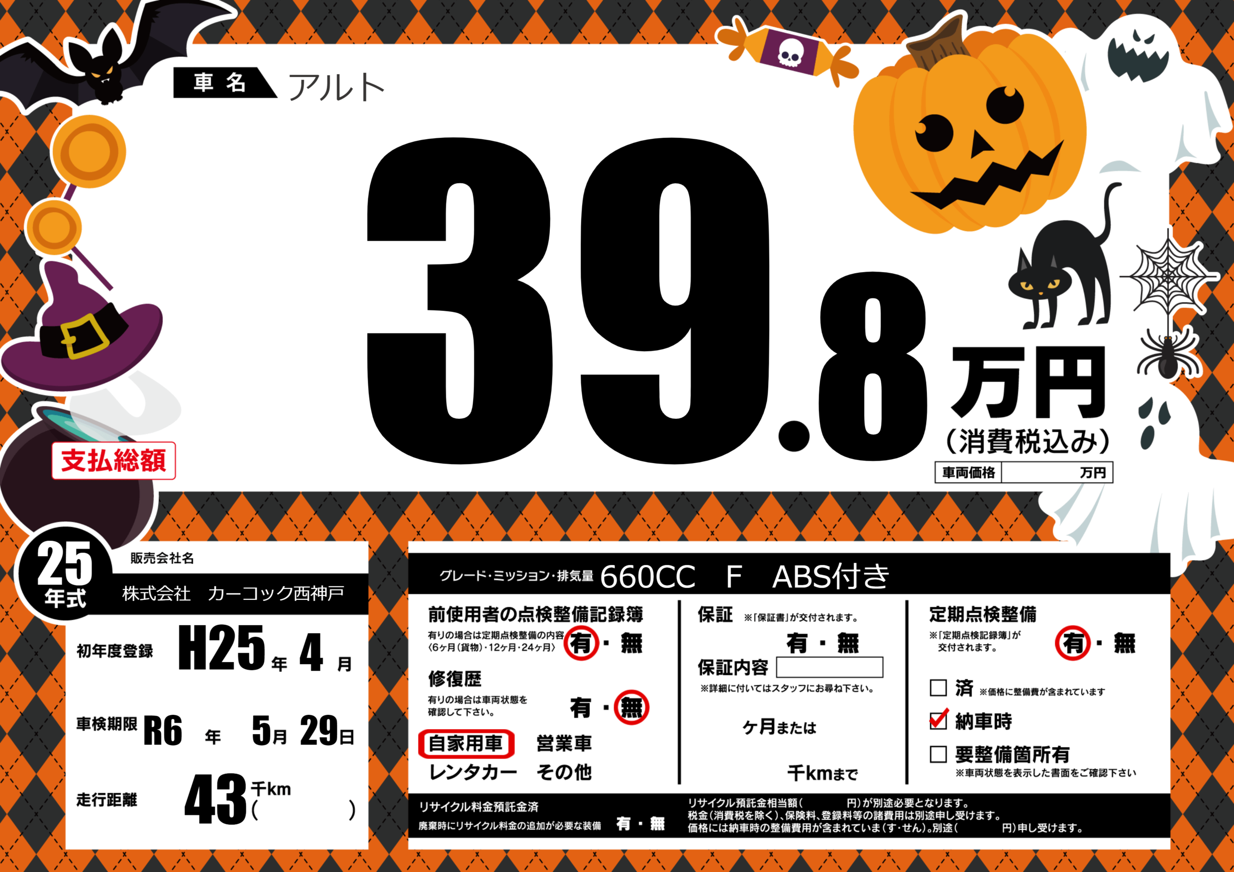 | 定期点検整備 | 定期点検整備あり 納車時あり | ||