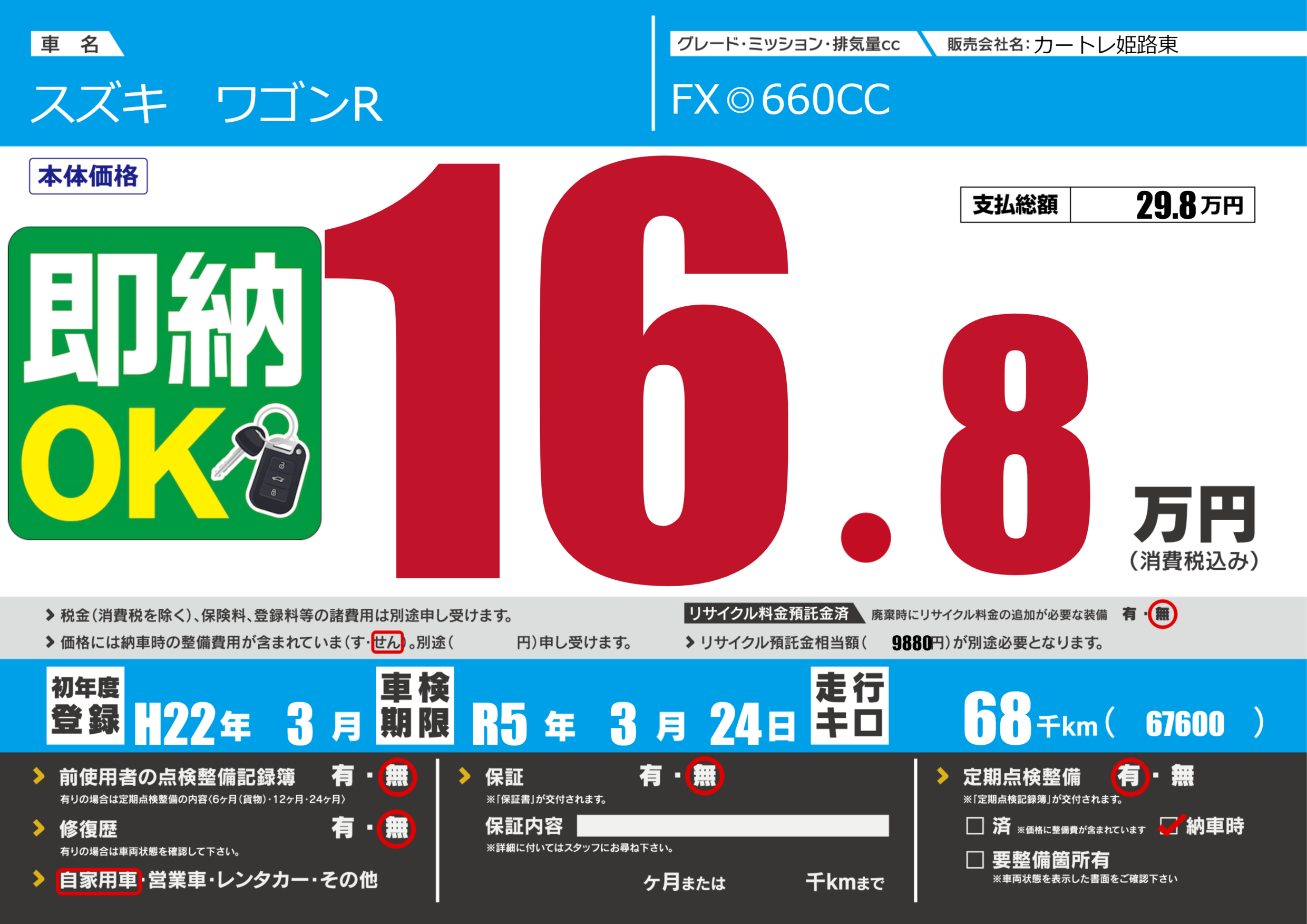 | 走行キロ | 6.8万km | 初年度登録 | H22年3月 |