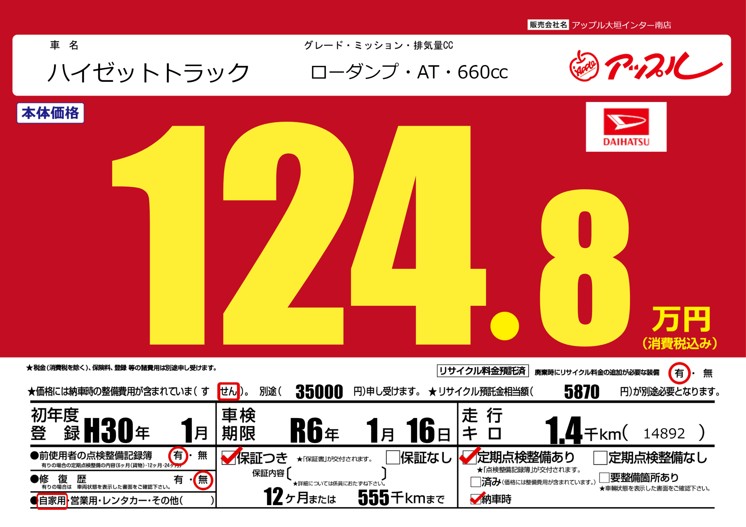 | 車名 | ハイゼットトラック | グレード ミッション 排気量 |