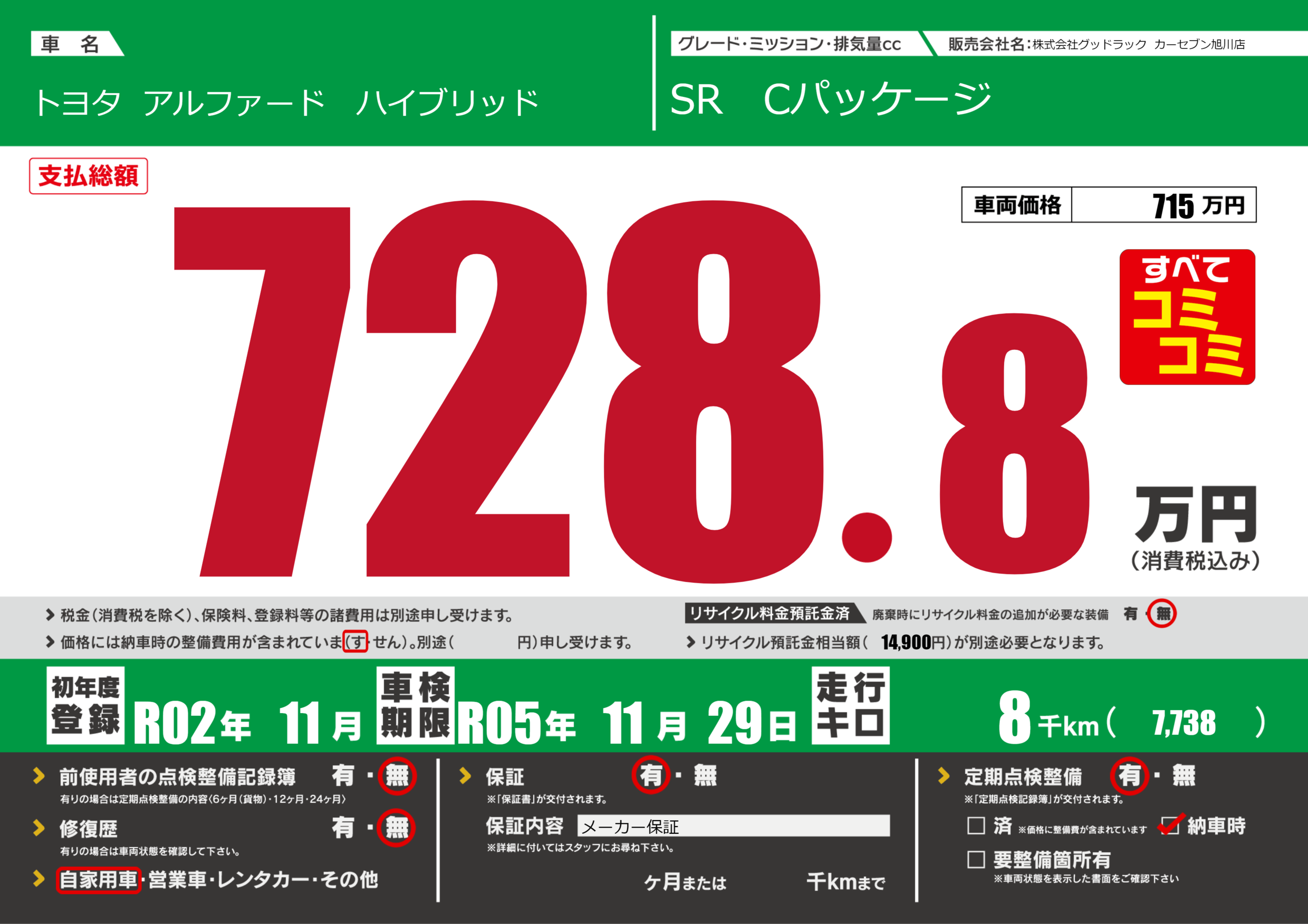 | 走行キロ | 0.8万km | 初年度登録 | R02年11月 |