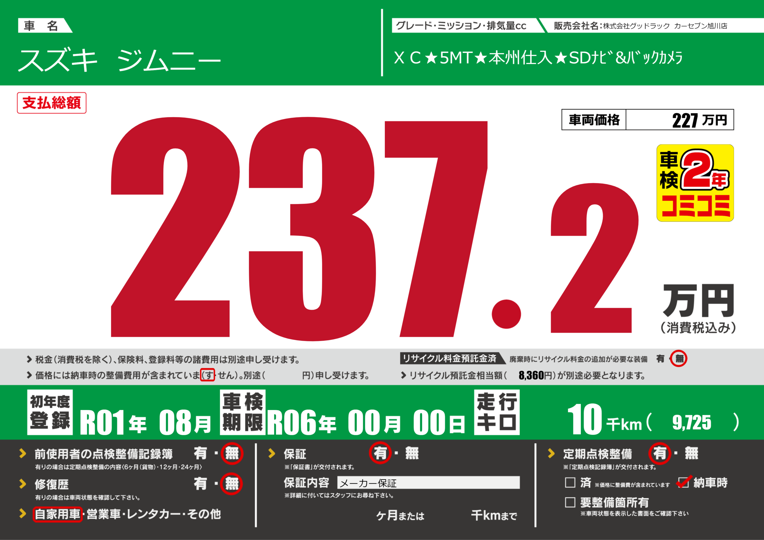 | 車名 | スズキ ジムニー | グレード ミッション 排気量 |