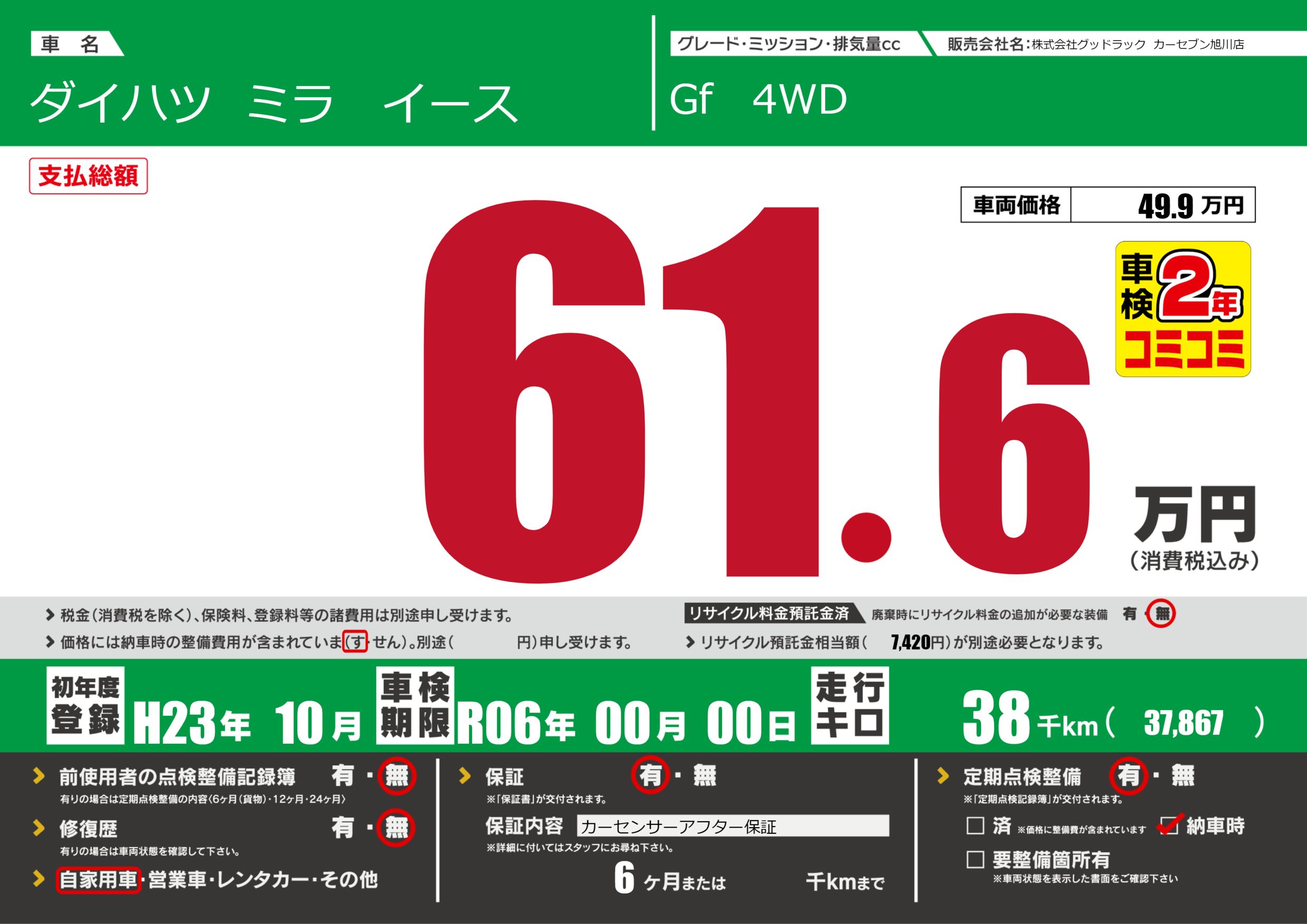 | 走行キロ | 3.8万km | 初年度登録 | H23年10月 |