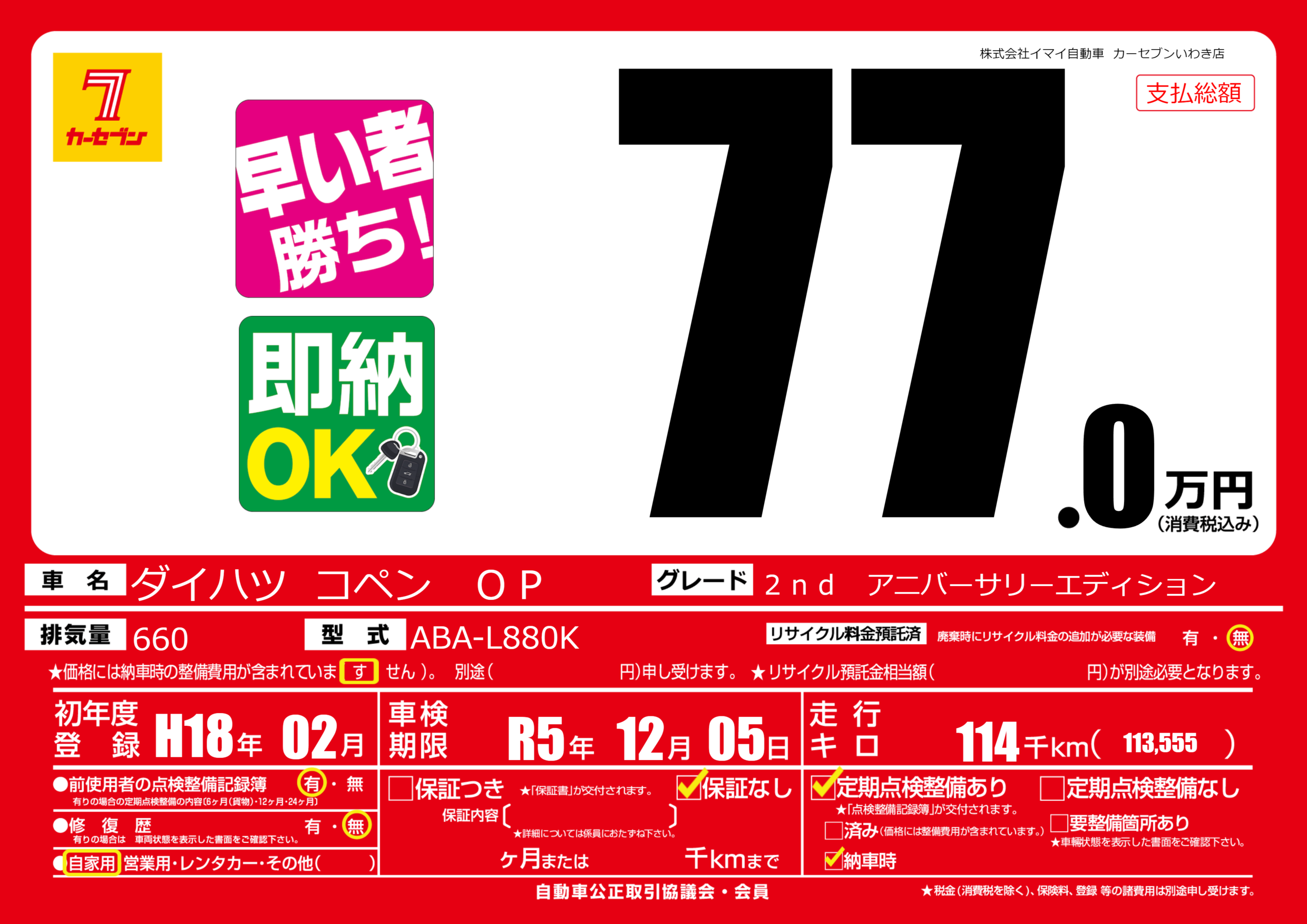 | 車名 | ダイハツ コペン OP | グレード ミッション 排気量 |