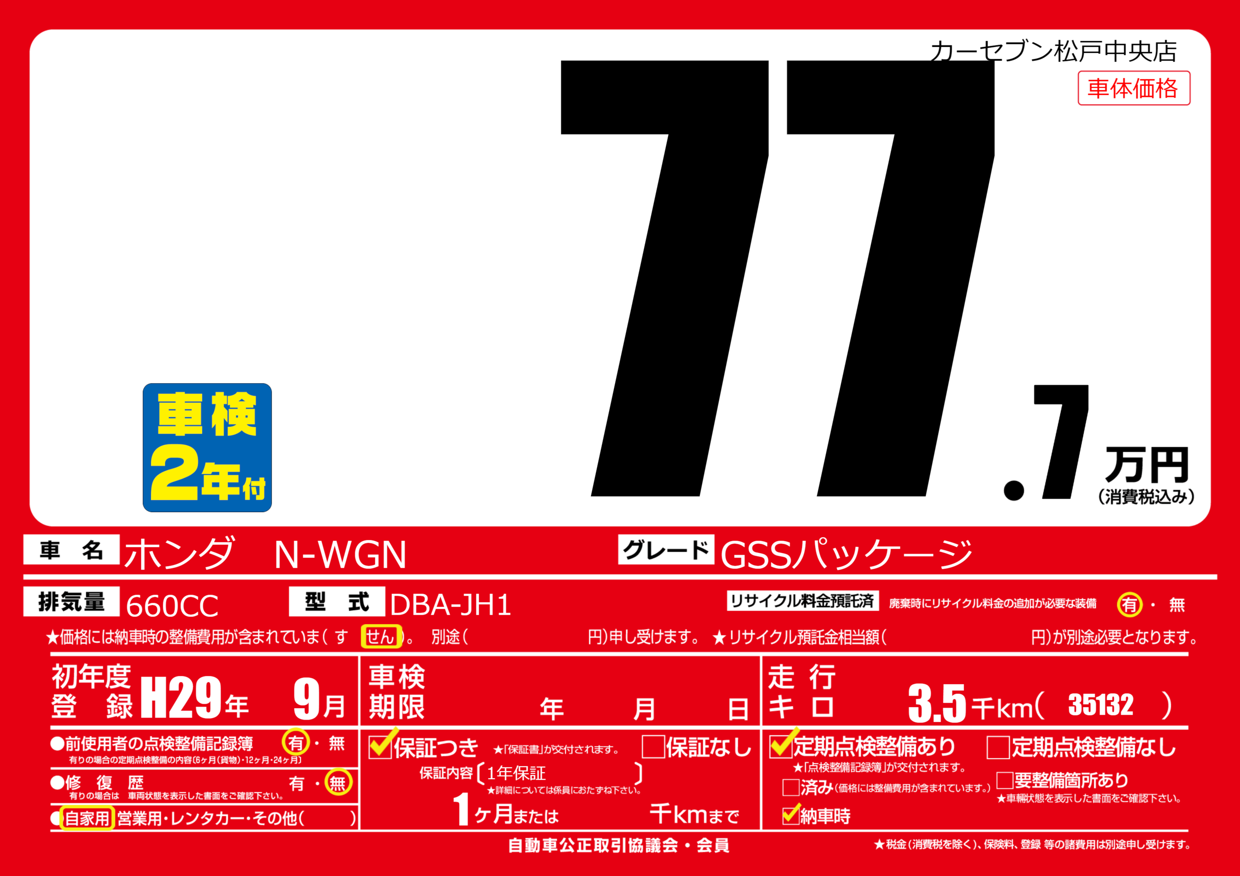 | 車名 | ホンダ N-WGN | グレード ミッション 排気量 |