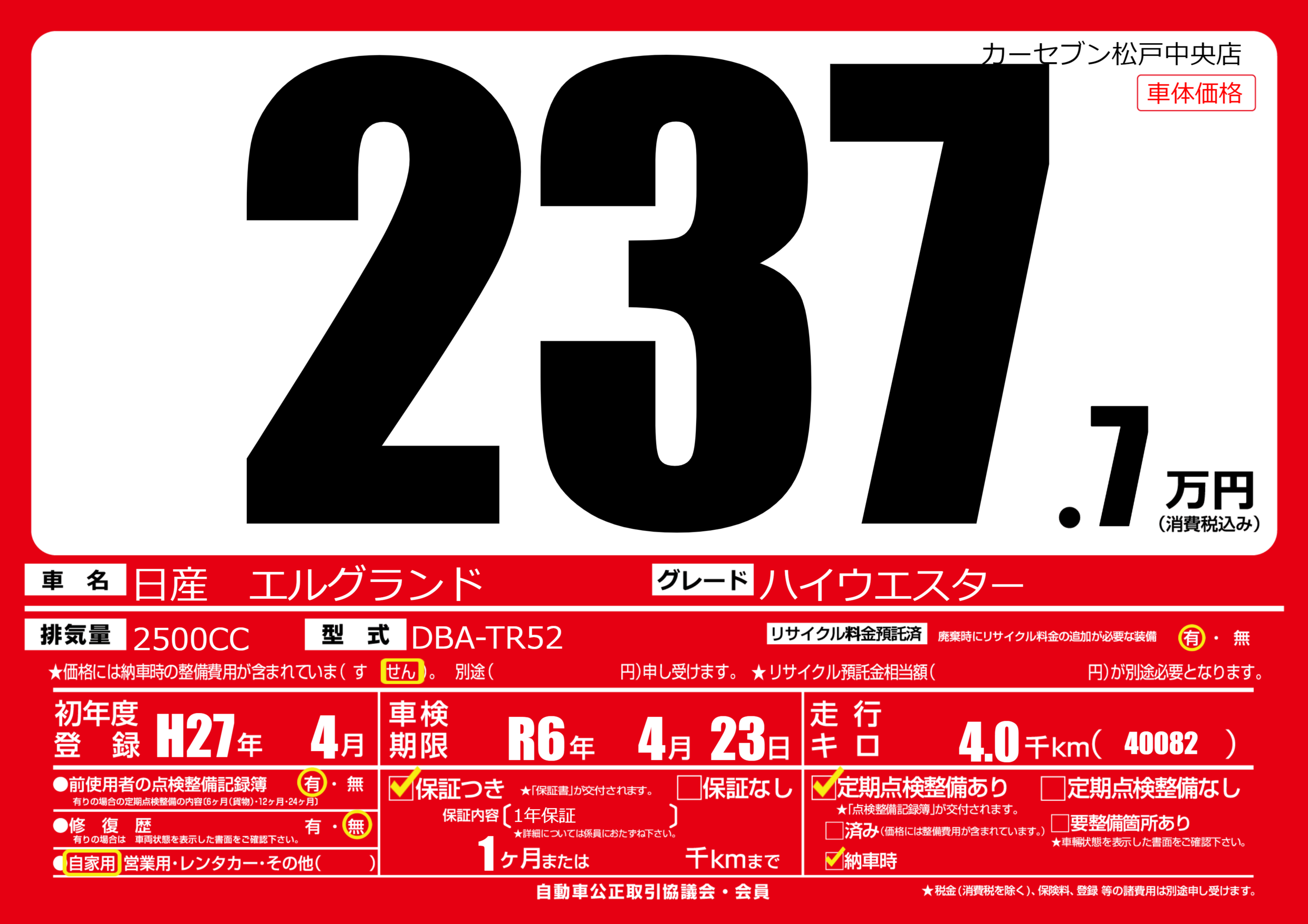| 走行キロ | 0.4万km | 初年度登録 | H27年4月 |