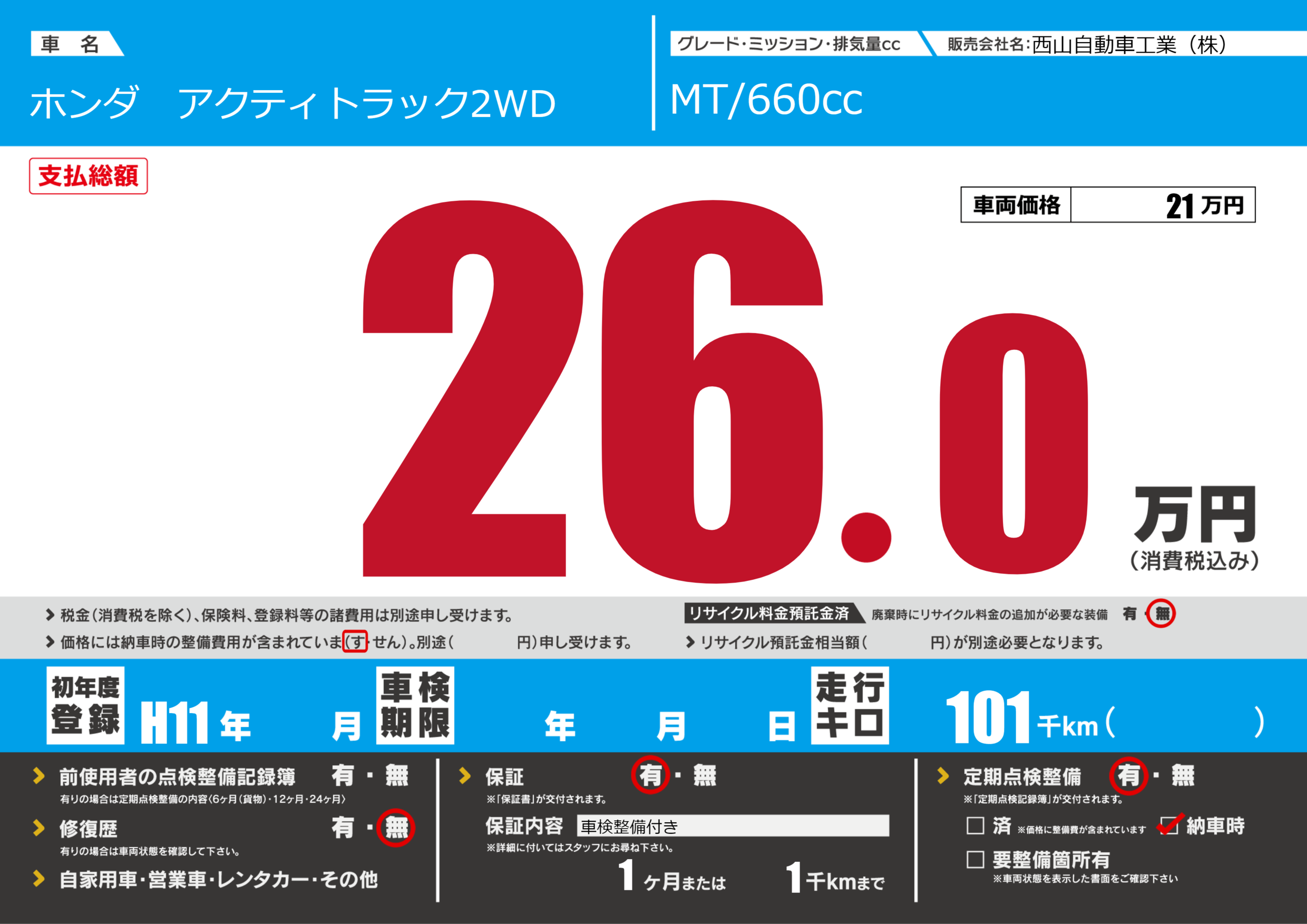 | 定期点検整備 | 定期点検整備あり 納車時あり | ||