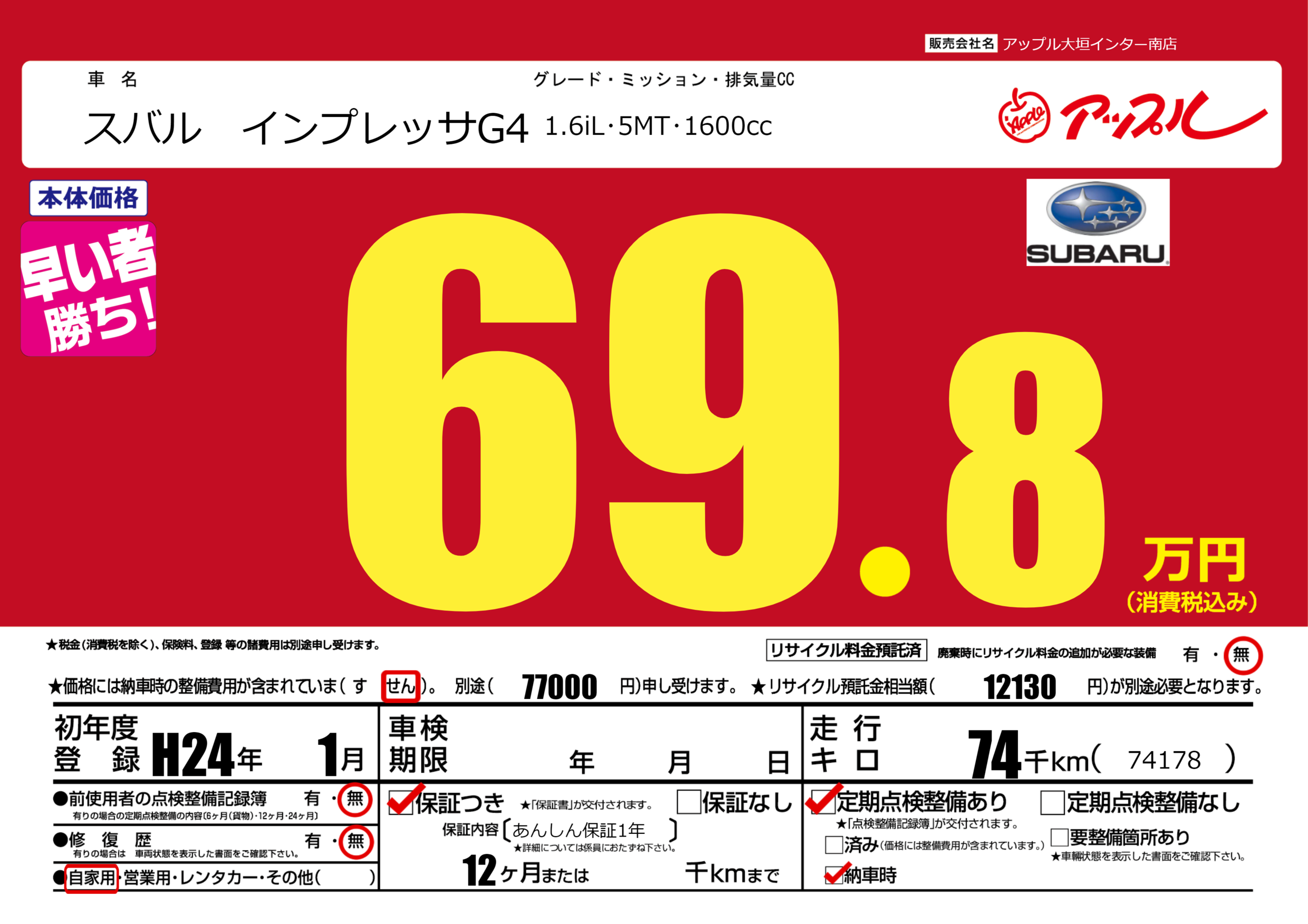 | 車名 | スバル インプレッサG4 | グレード ミッション 排気量 |
