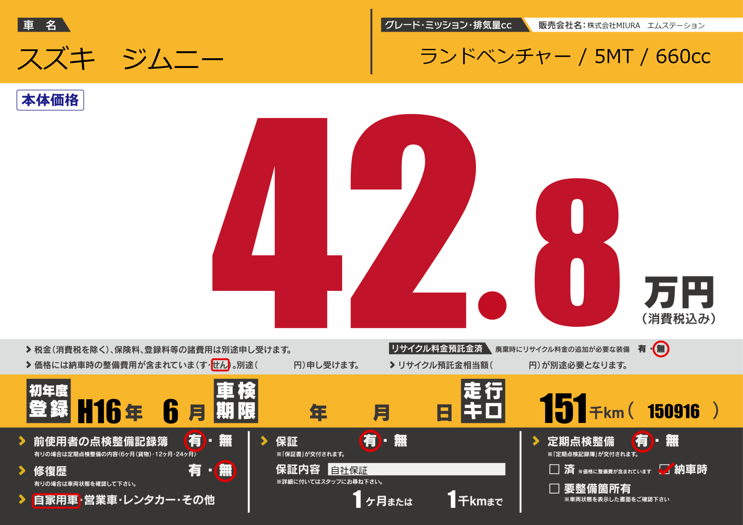 | 走行キロ | 15.1万km | 初年度登録 | H16年6月 |