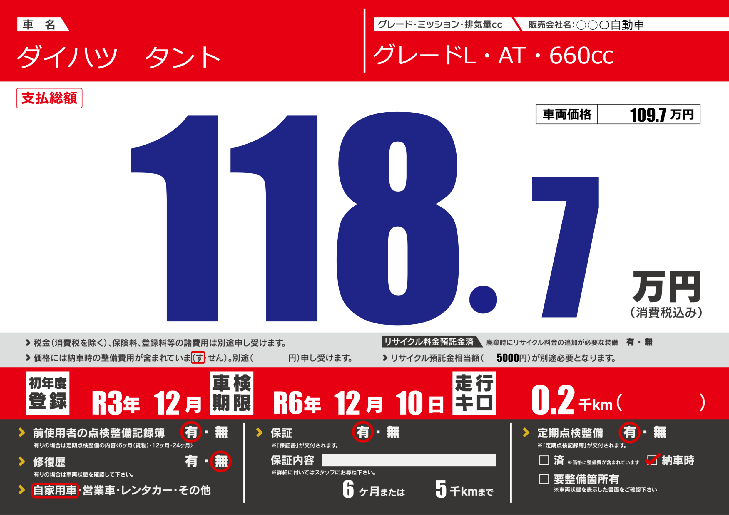 | 定期点検整備 | 定期点検整備あり 納車時あり | ||