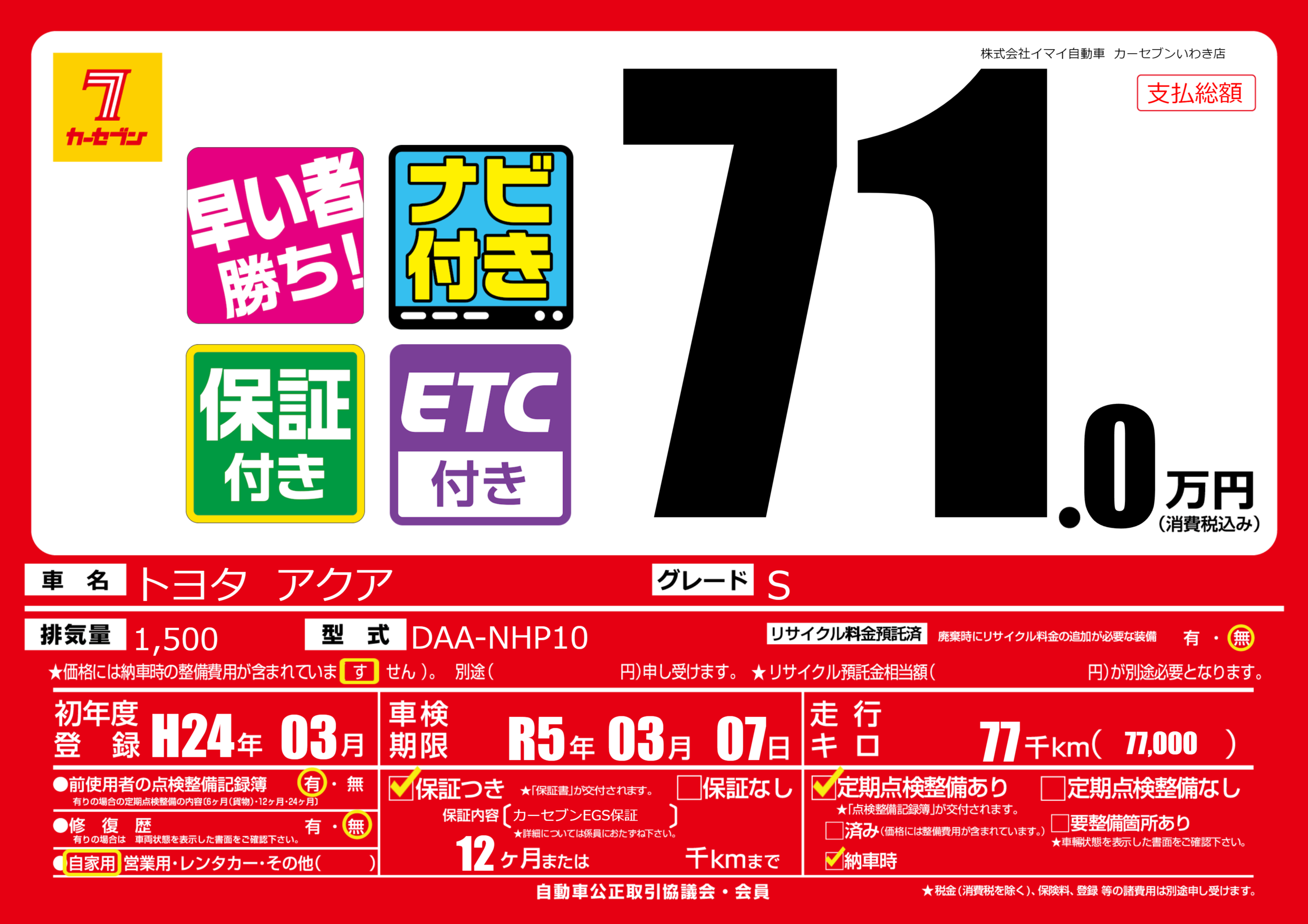 | 車名 | トヨタ アクア | グレード ミッション 排気量 |