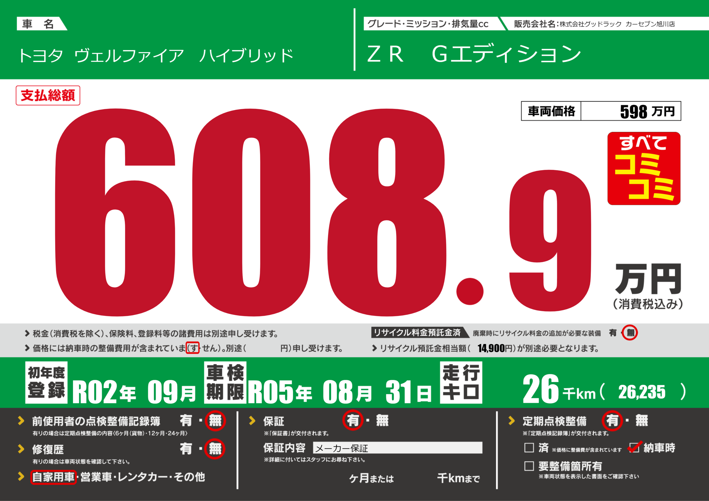 | 走行キロ | 2.6万km | 初年度登録 | R02年09月 |