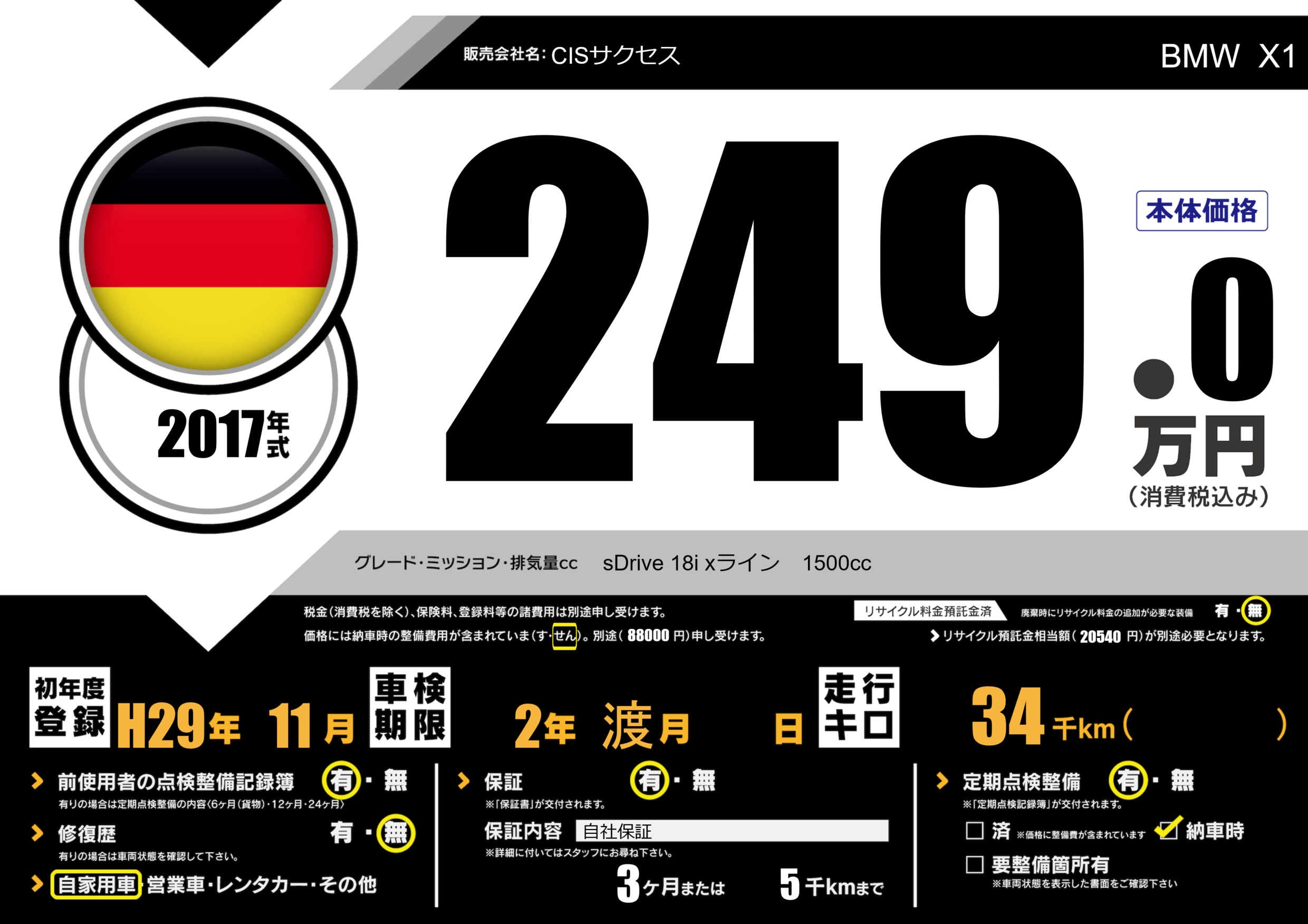 | 車名 | BMW X1 | グレード ミッション 排気量 |