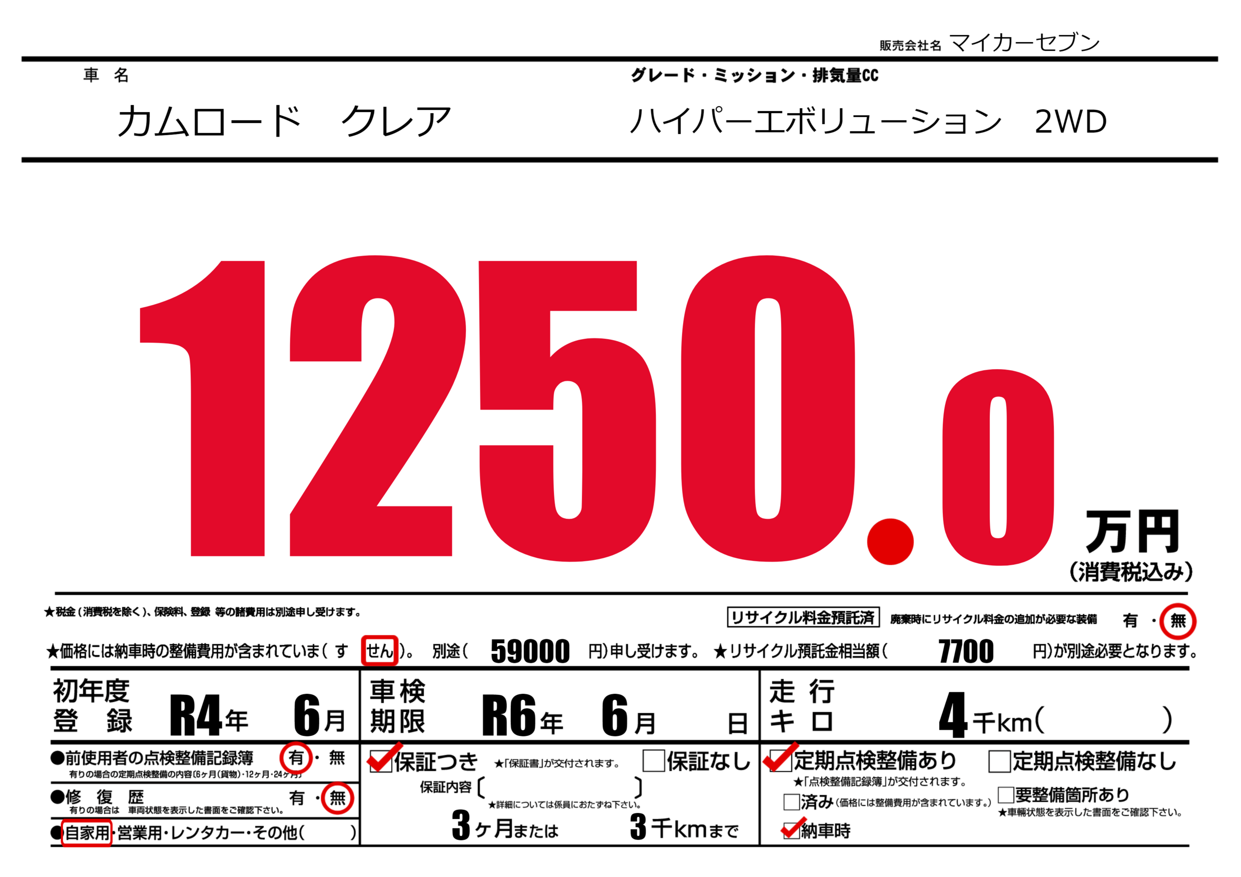 | 車名 | カムロード クレア | グレード ミッション 排気量 |