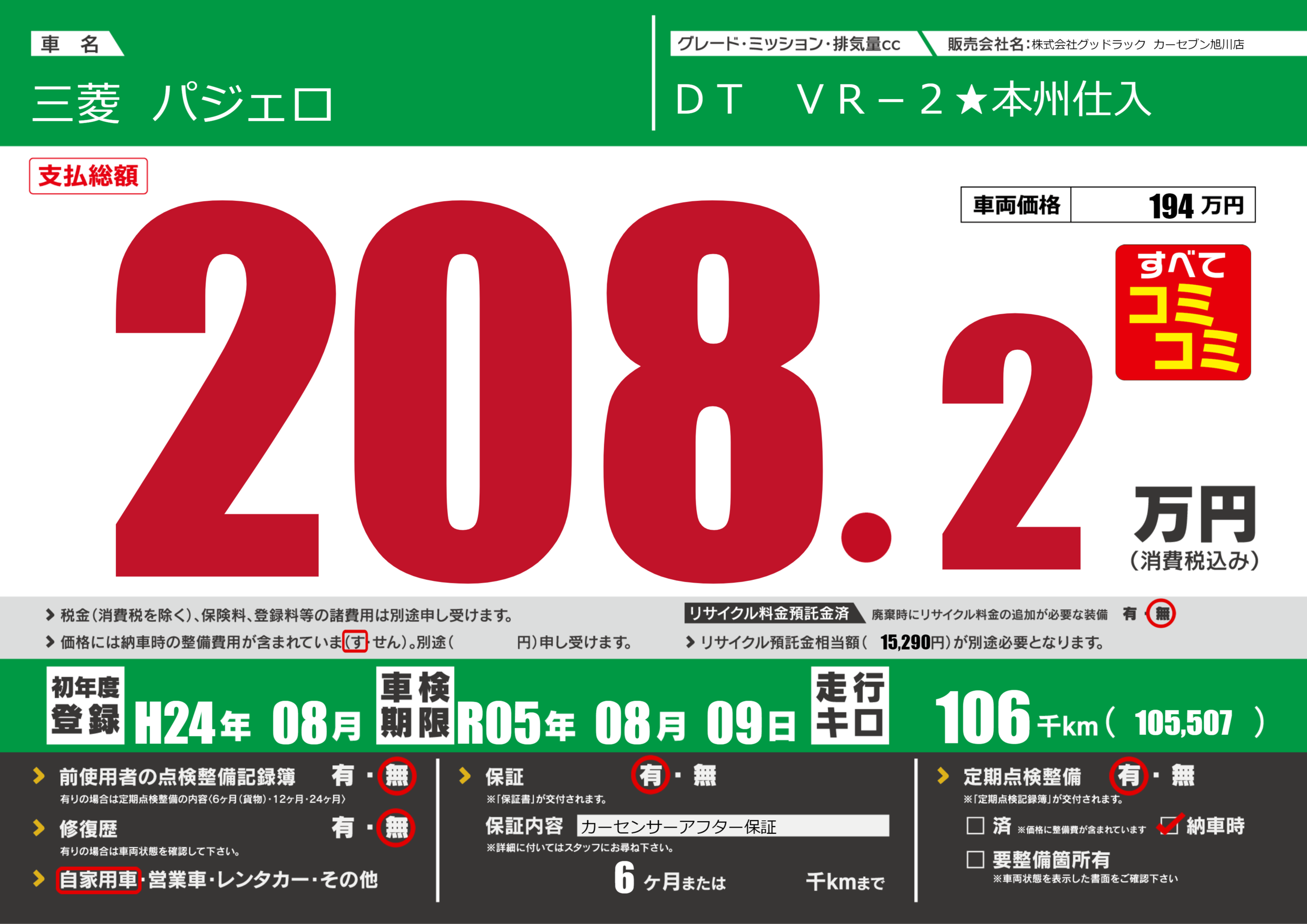 | 車名 | 三菱 パジェロ | グレード ミッション 排気量 |
