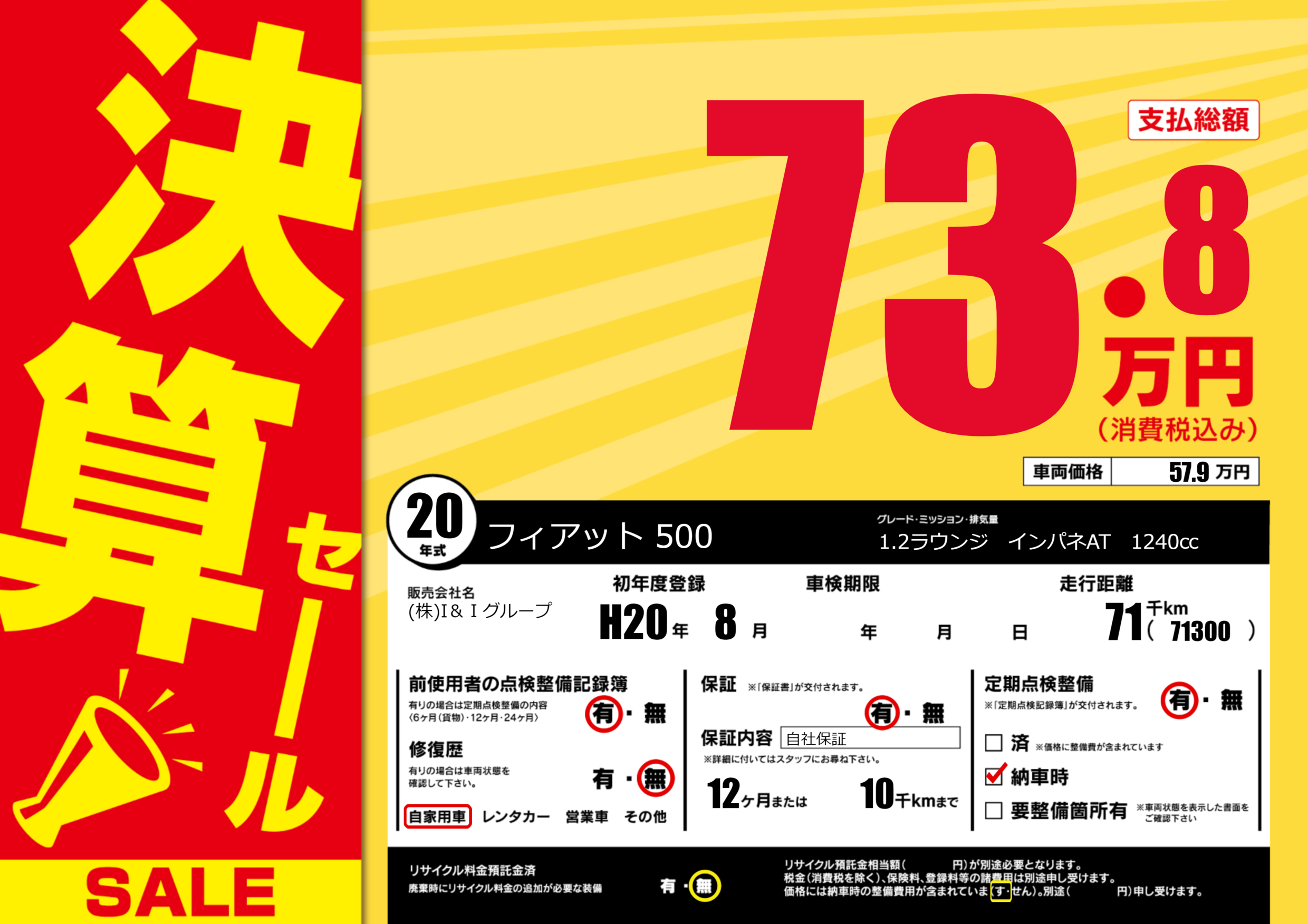 | 車名 | フィアット 500 | グレード ミッション 排気量 |