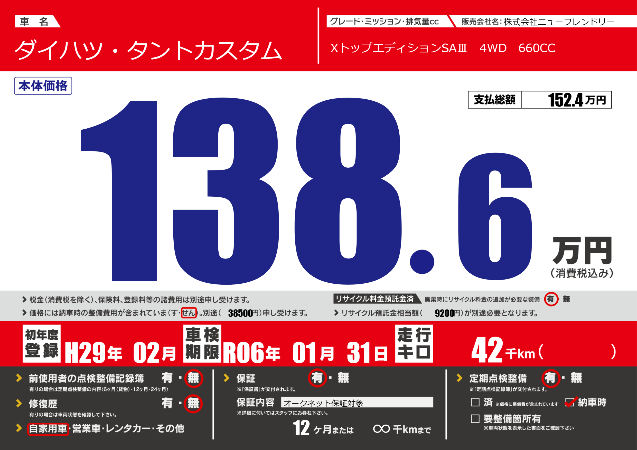 | 車名 | ダイハツ・タントカスタム | グレード ミッション 排気量 |