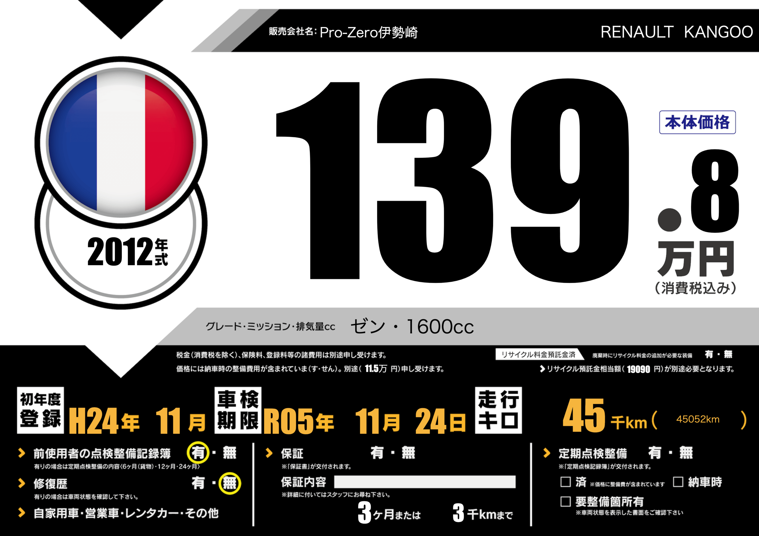 | 車名 | RENAULT KANGOO | グレード ミッション 排気量 |