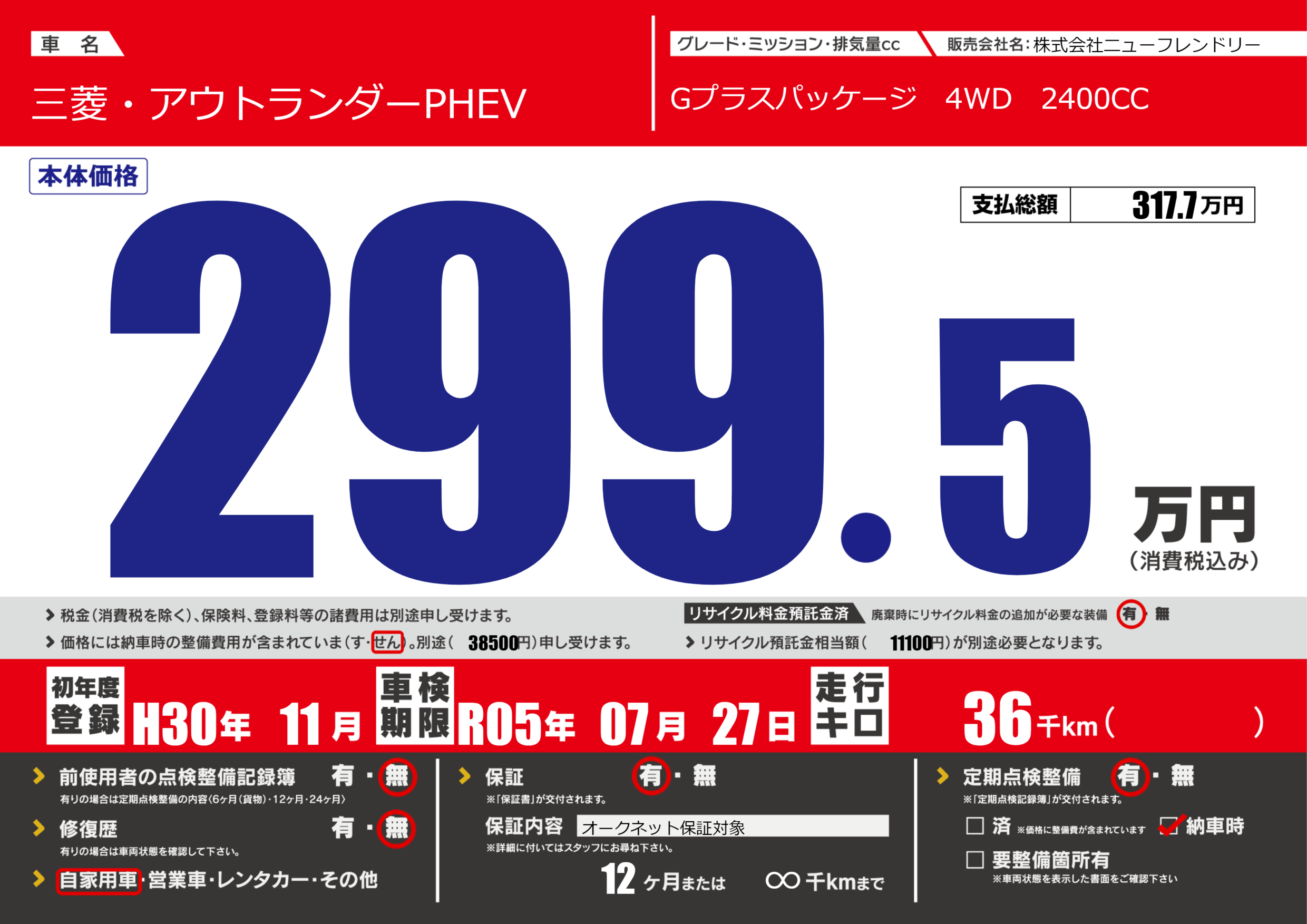 | 車名 | 三菱・アウトランダーPHEV | グレード ミッション 排気量 |