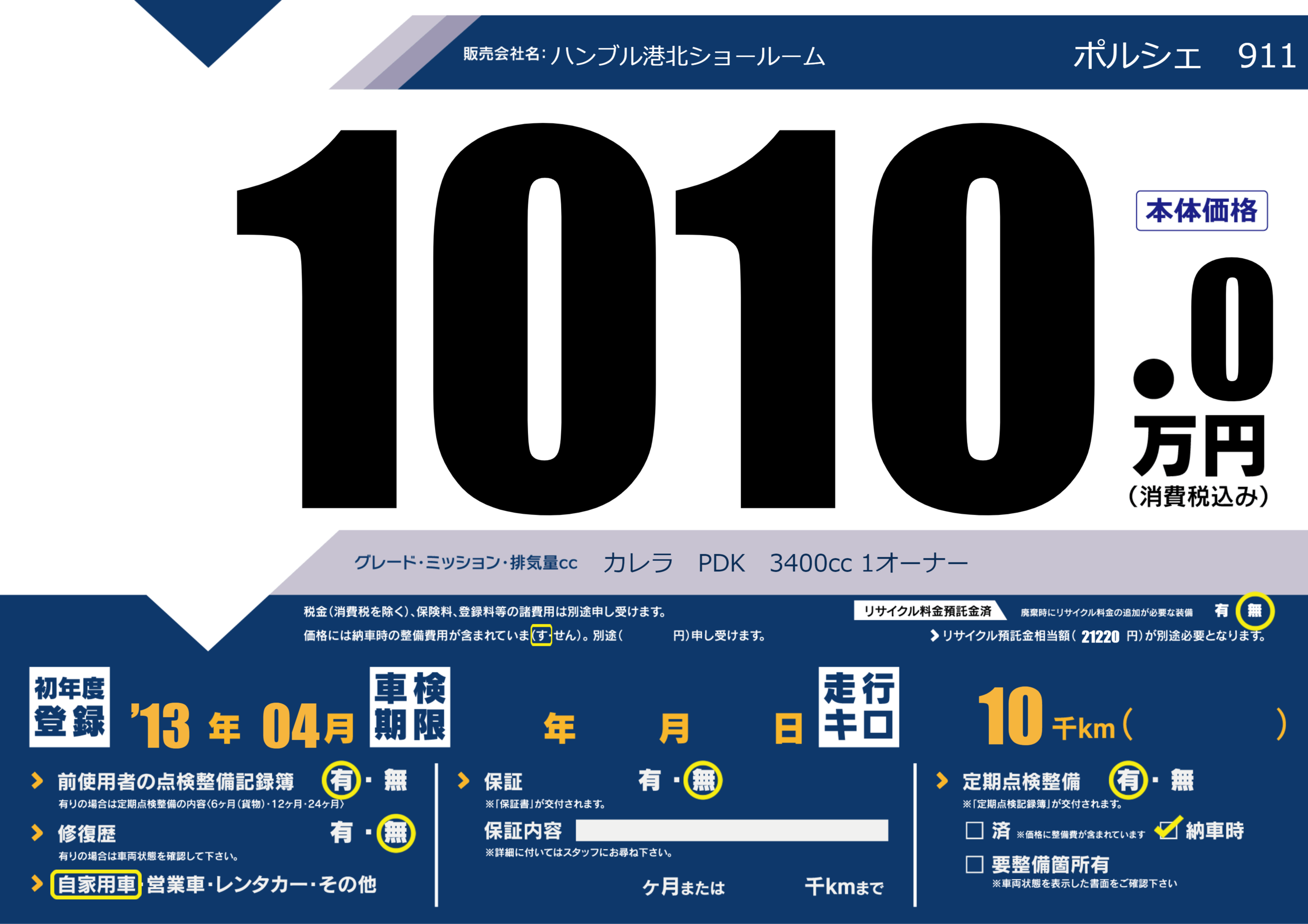 | 車名 | ポルシェ 911 | グレード ミッション 排気量 |
