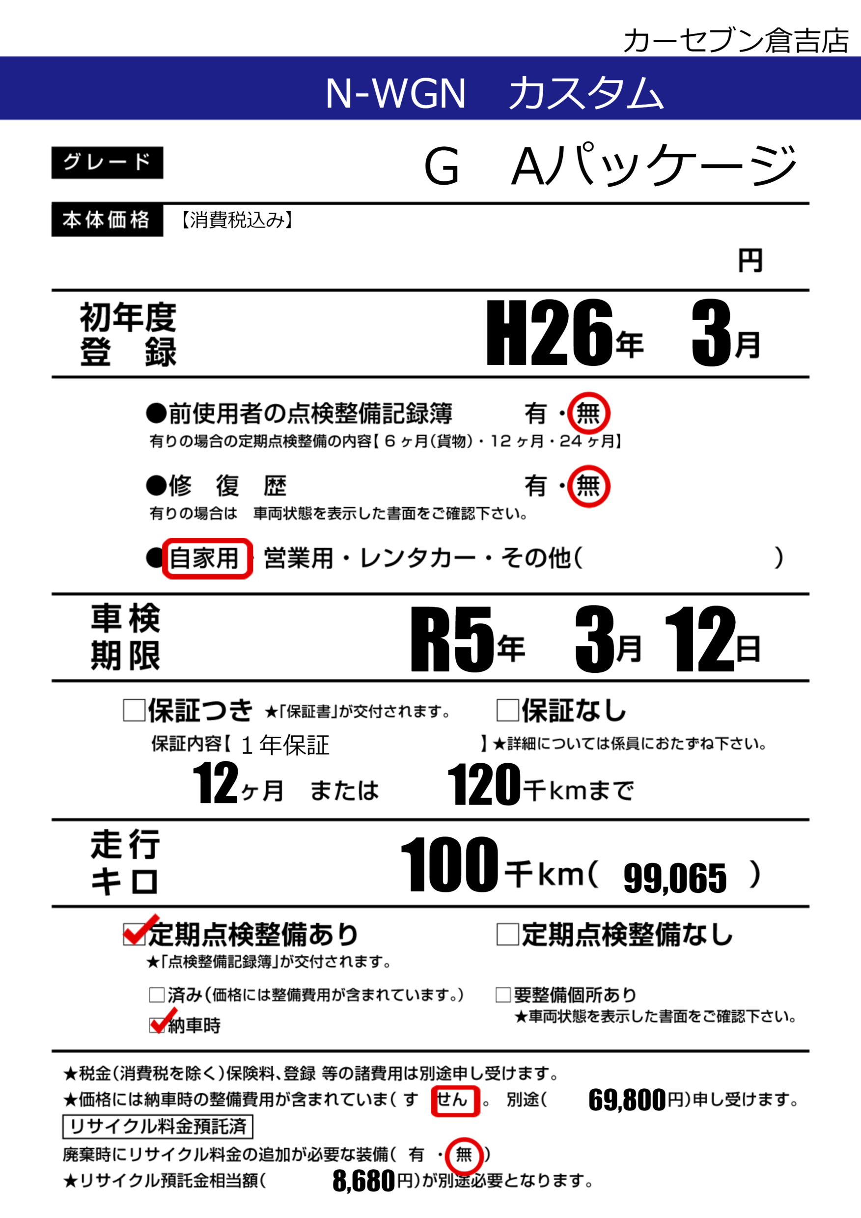 | 走行キロ | 10万km | 初年度登録 | H26年3月 |