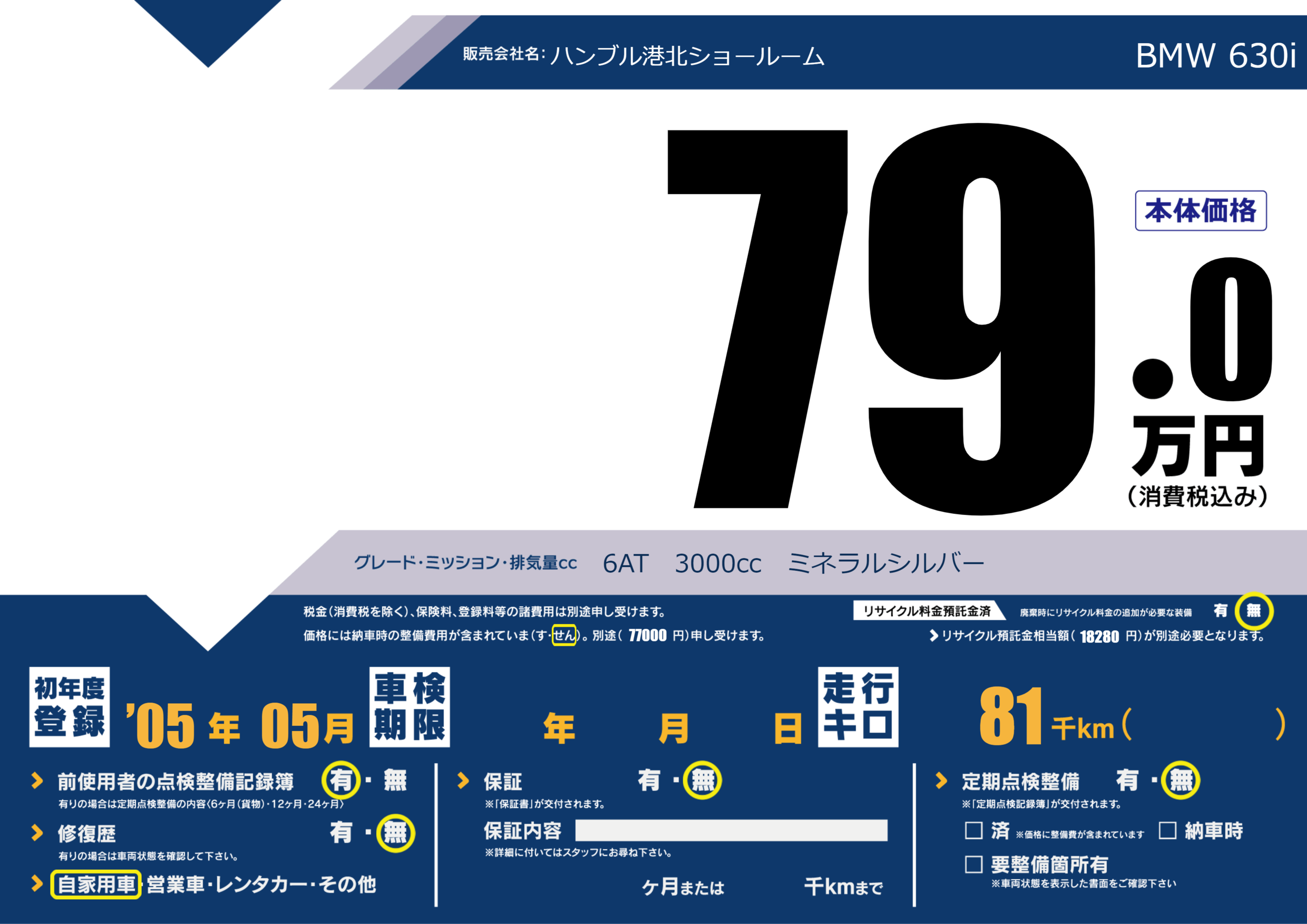 | 車名 | BMW 630i | グレード ミッション 排気量 |