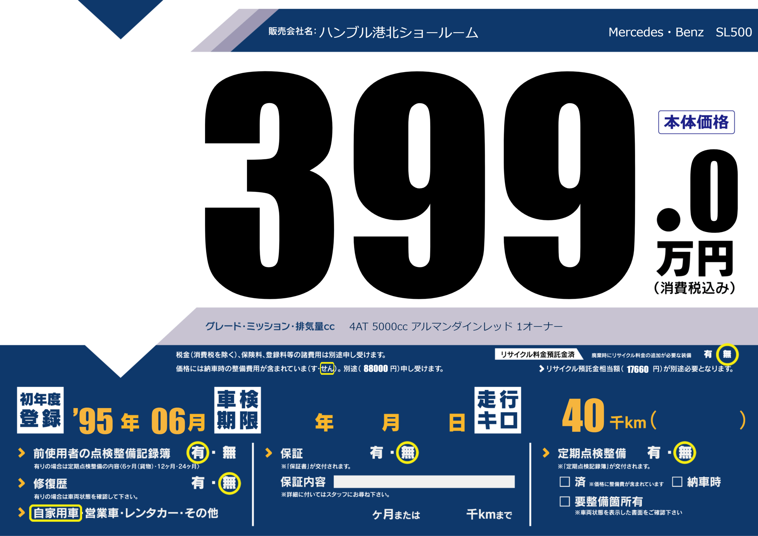 | 走行キロ | 4万km | 初年度登録 | ’95年06月 |