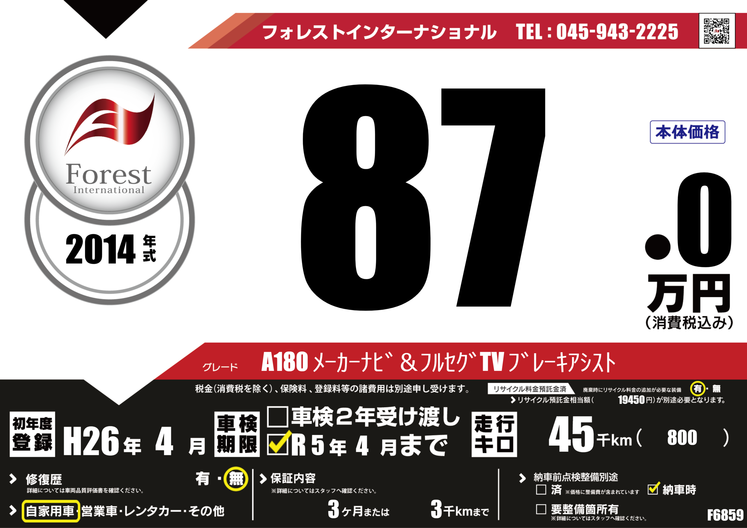 | 走行キロ | 4.5万km | 初年度登録 | H26年4月 |