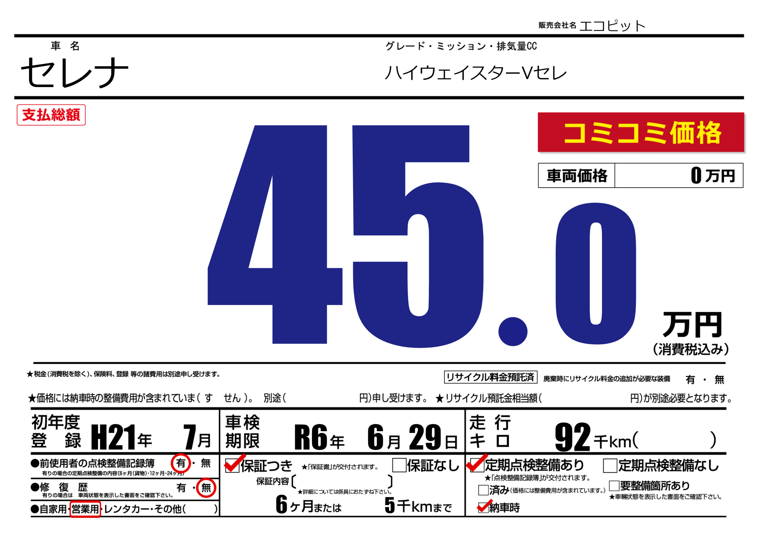 保証付き 保証内容(---) 6ヶ月または(5)千kmまで |