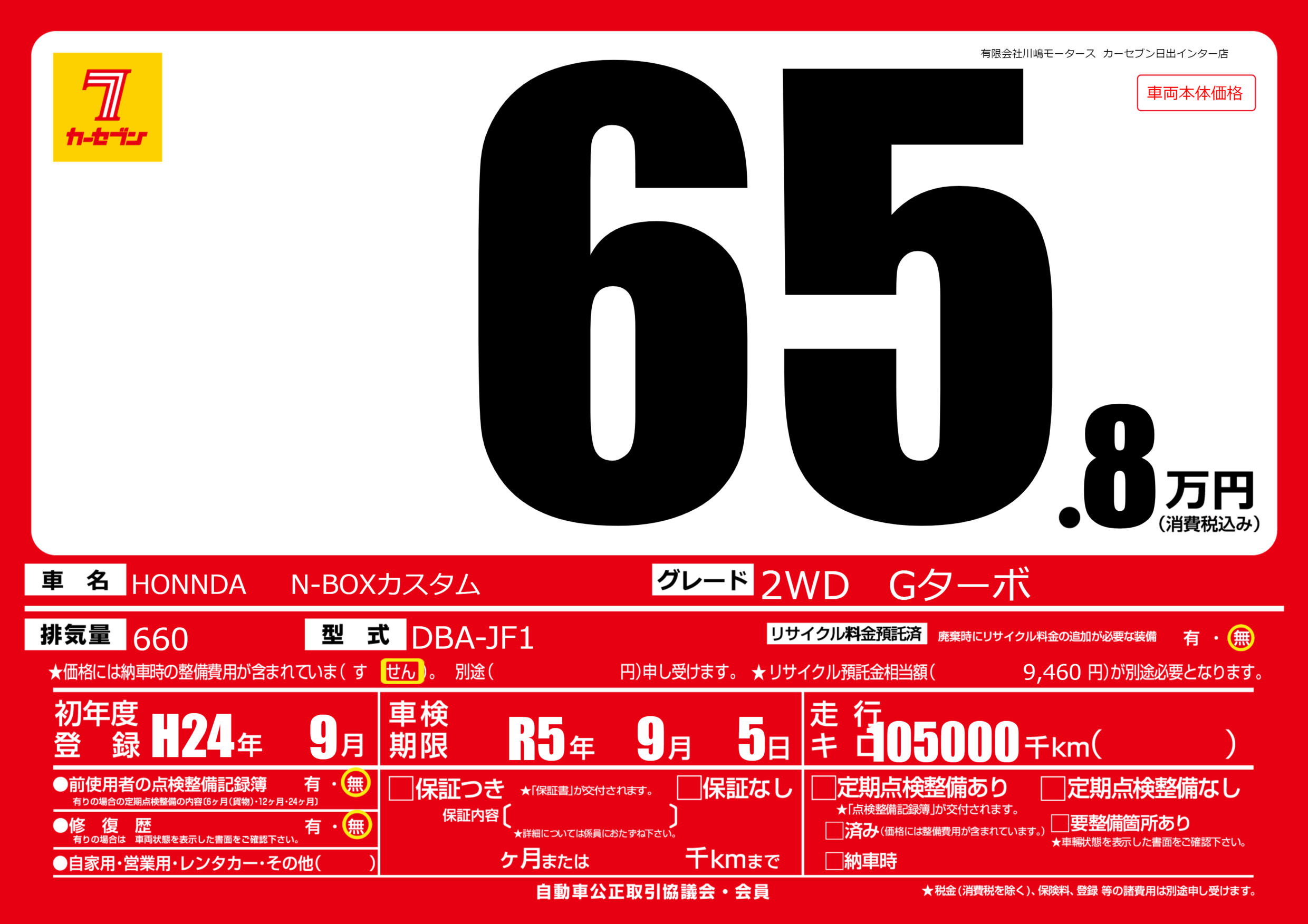 | 車名 | HONNDA N-BOXカスタム | グレード ミッション 排気量 |