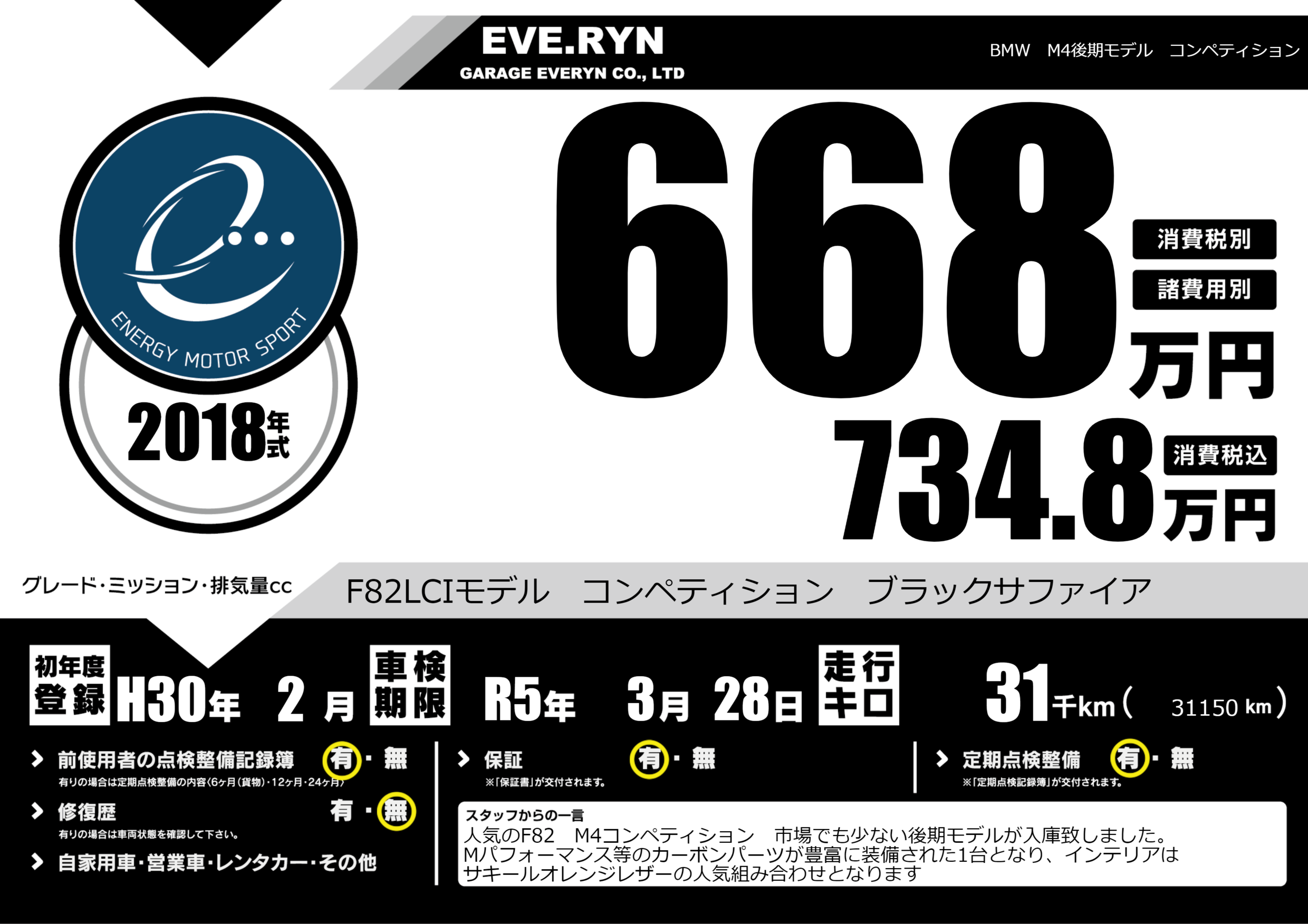 | 車名 | BMW M4後期モデル コンペティション | グレード ミッション 排気量 |