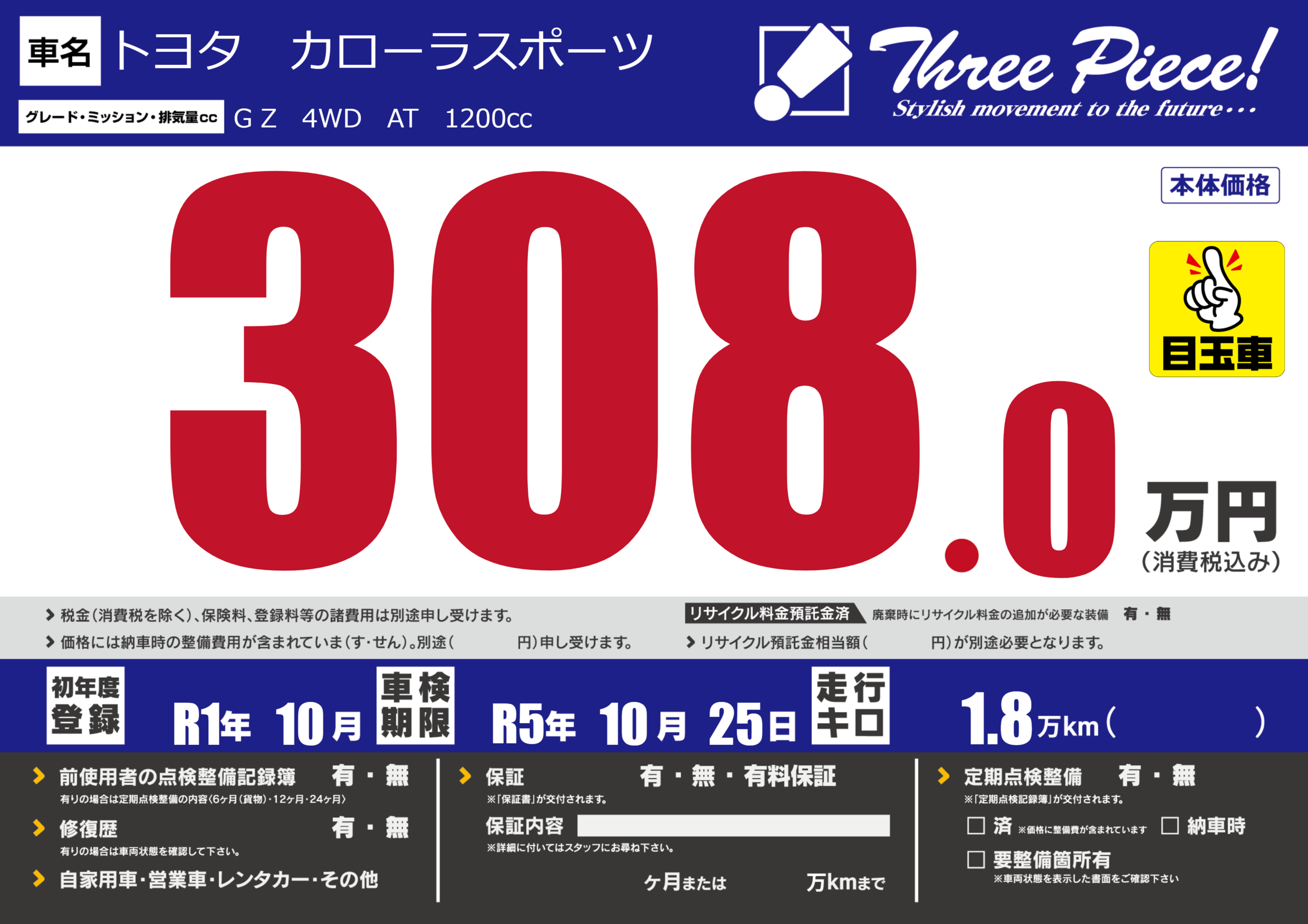 | 車名 | トヨタ カローラスポーツ | グレード ミッション 排気量 |