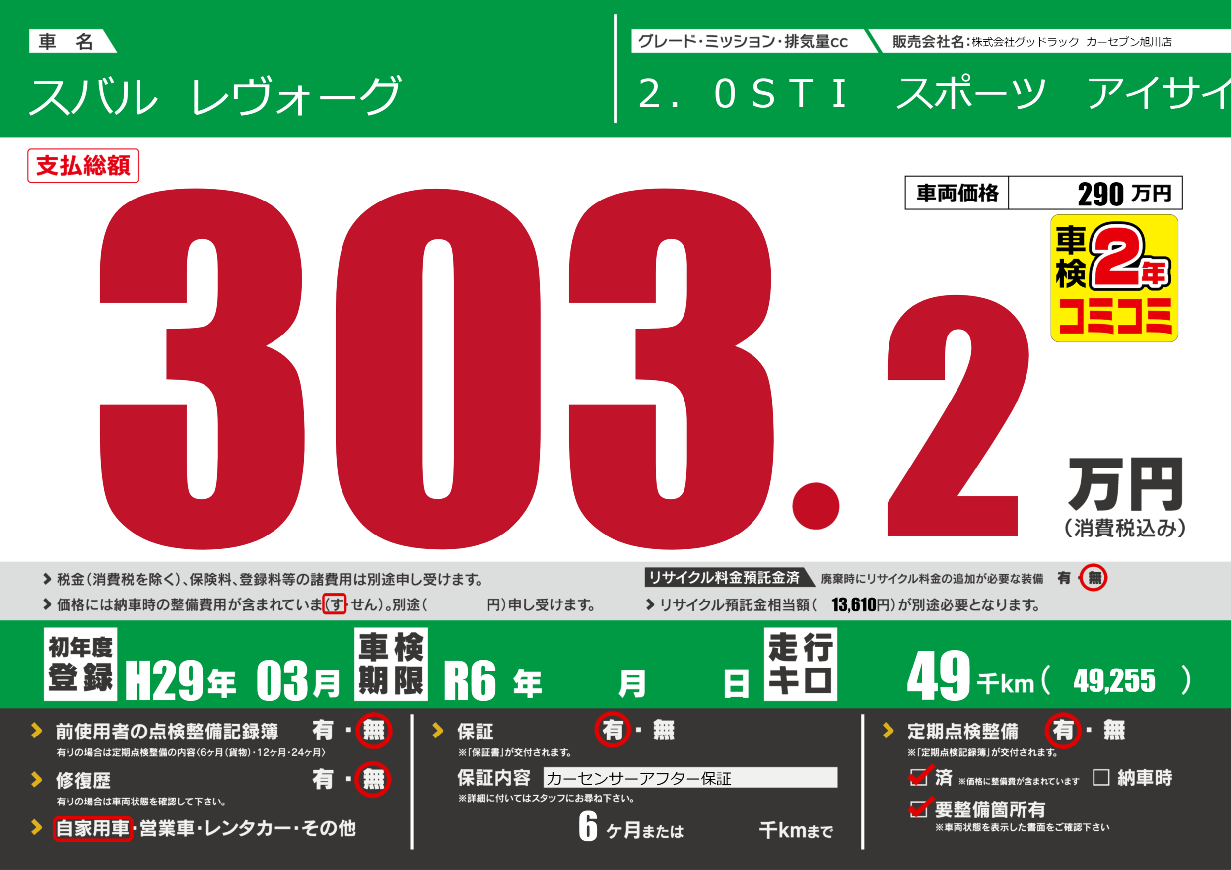 | 車名 | スバル レヴォーグ | グレード ミッション 排気量 |