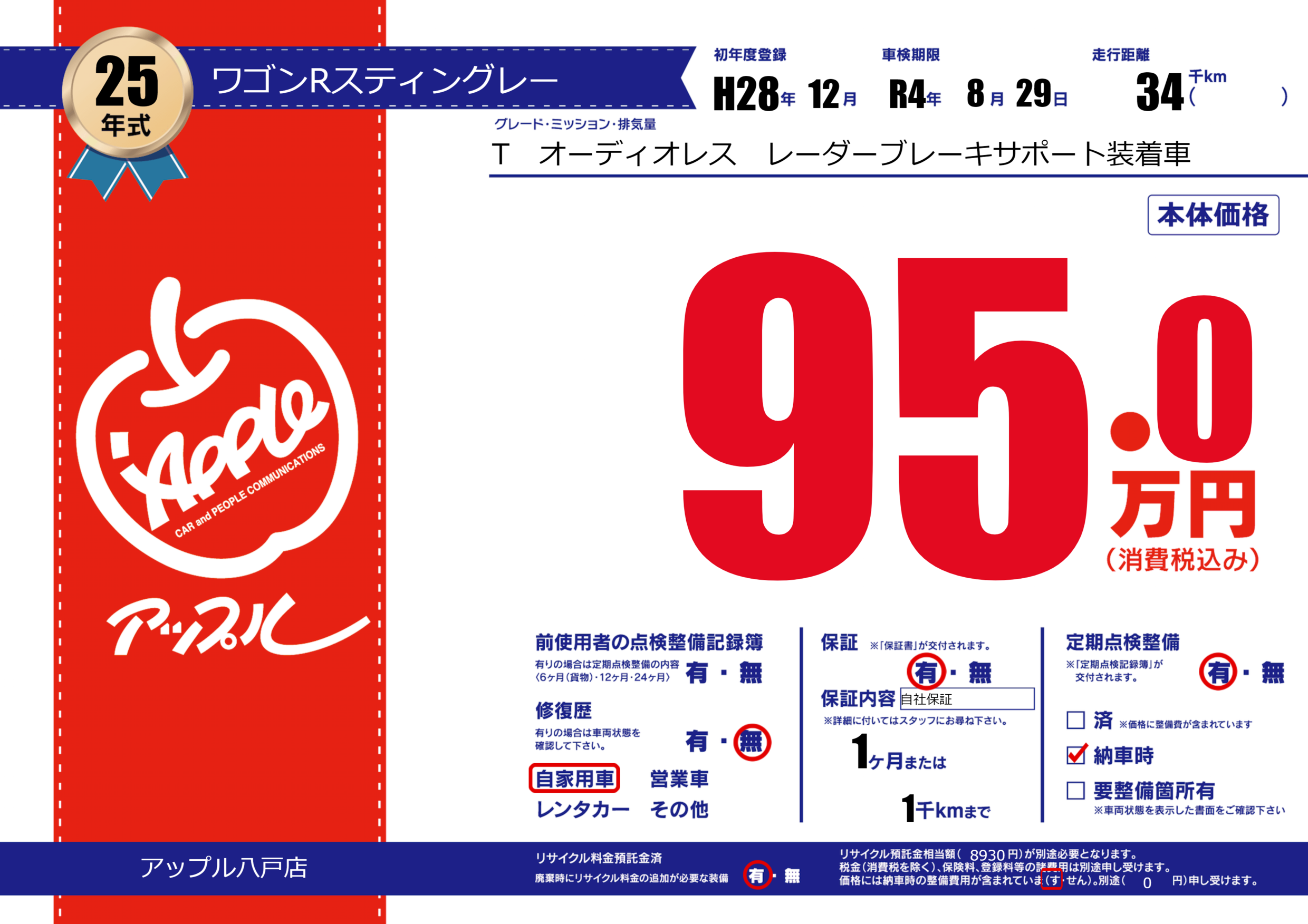 あり | 車検制限 | R4年8月29月 |