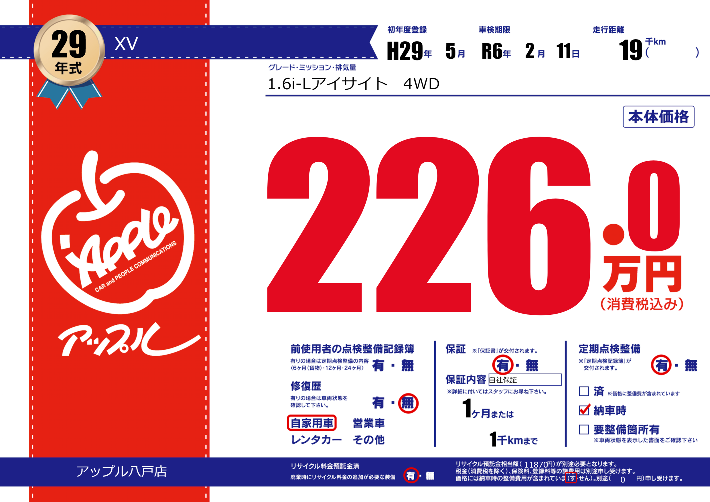 | 走行キロ | 1.9万km | 初年度登録 | H29年5月 |