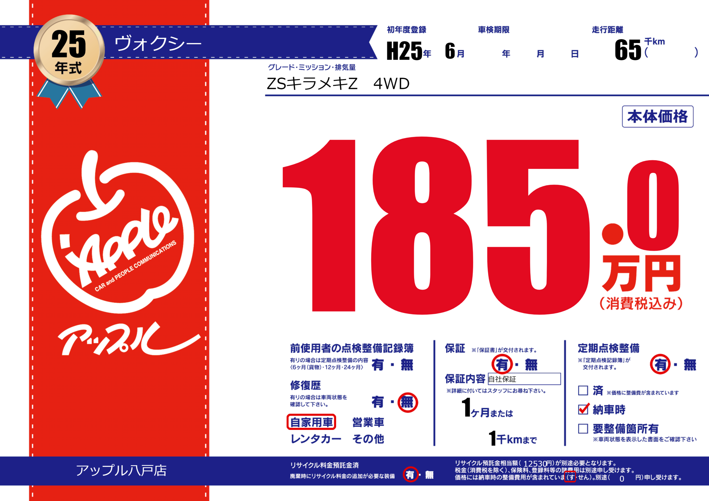 保証付き 保証内容(自社保証) 1ヶ月または(1)千kmまで |