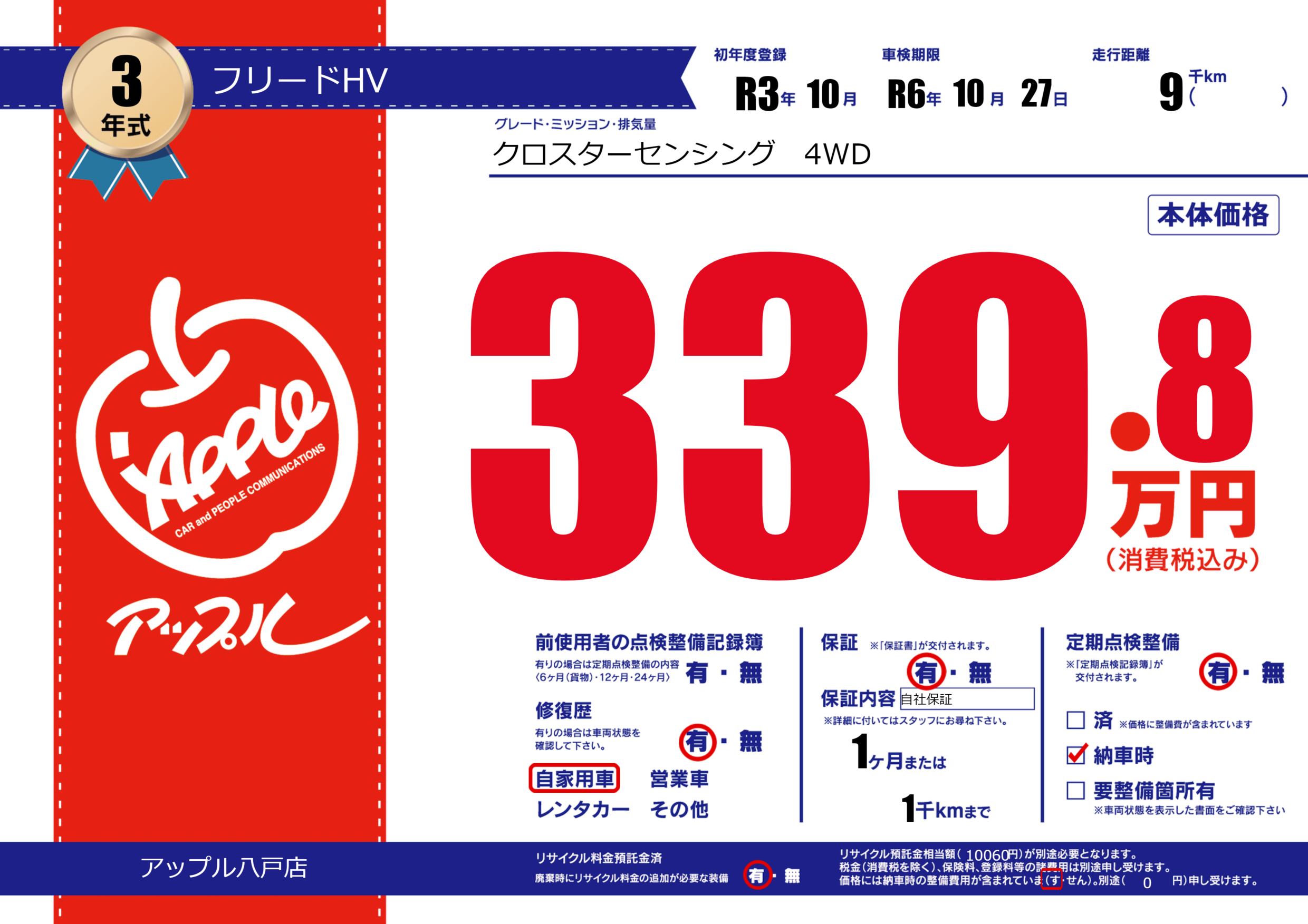 | 走行キロ | 0.9万km | 初年度登録 | R3年10月 |