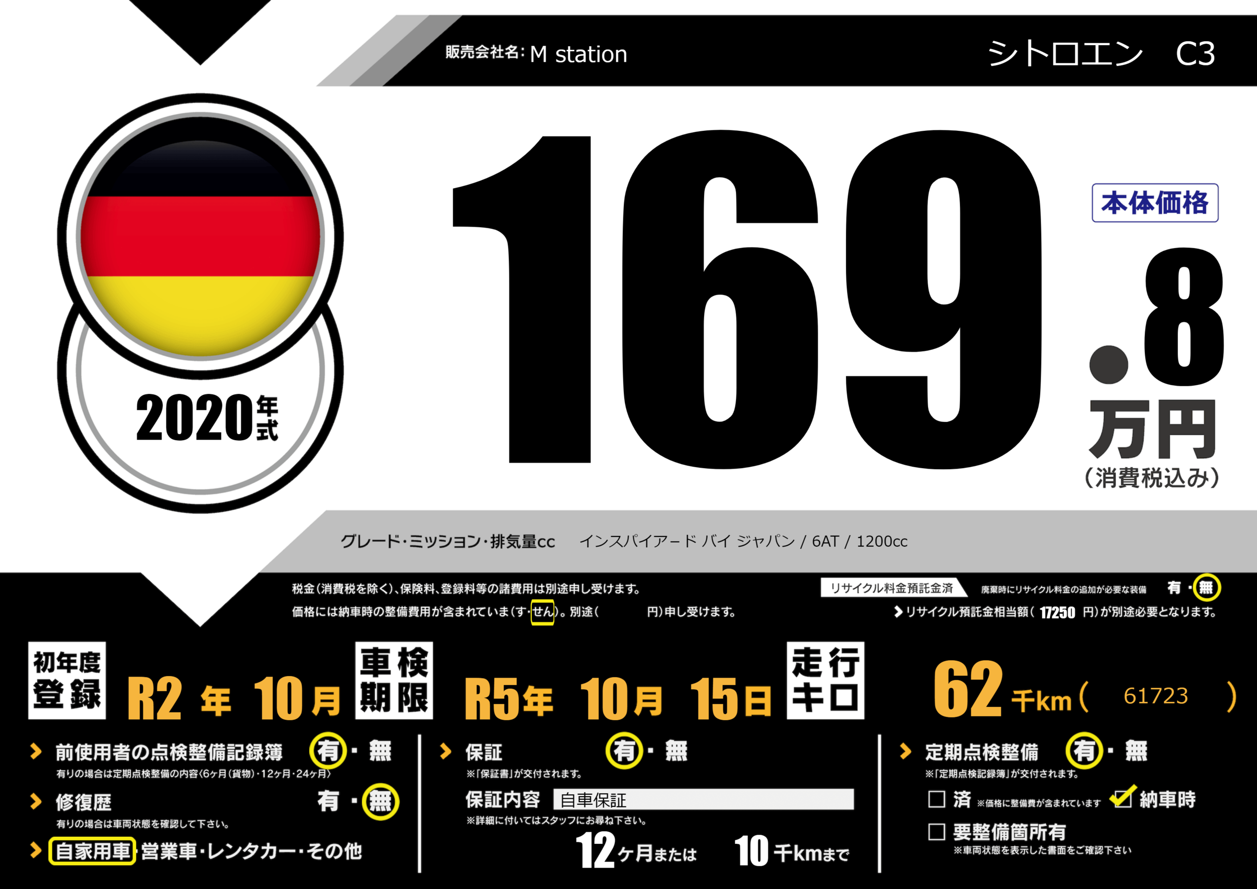 | 車名 | シトロエン C3 | グレード ミッション 排気量 |