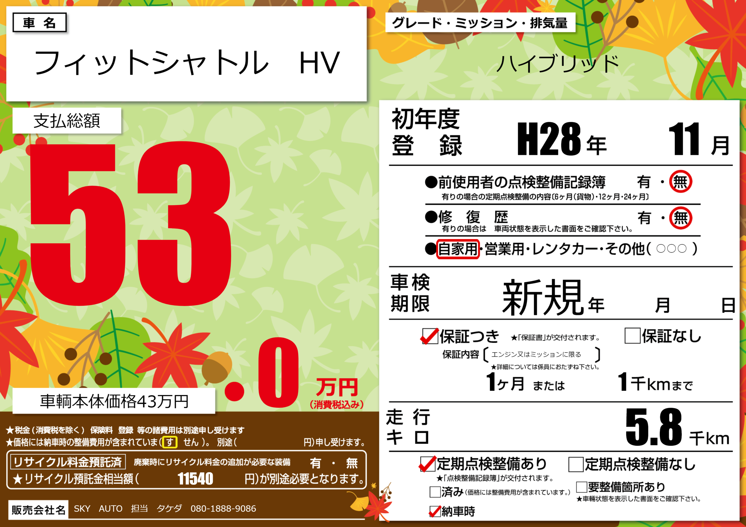 | 走行キロ | 0.5万km | 初年度登録 | H28年11月 |