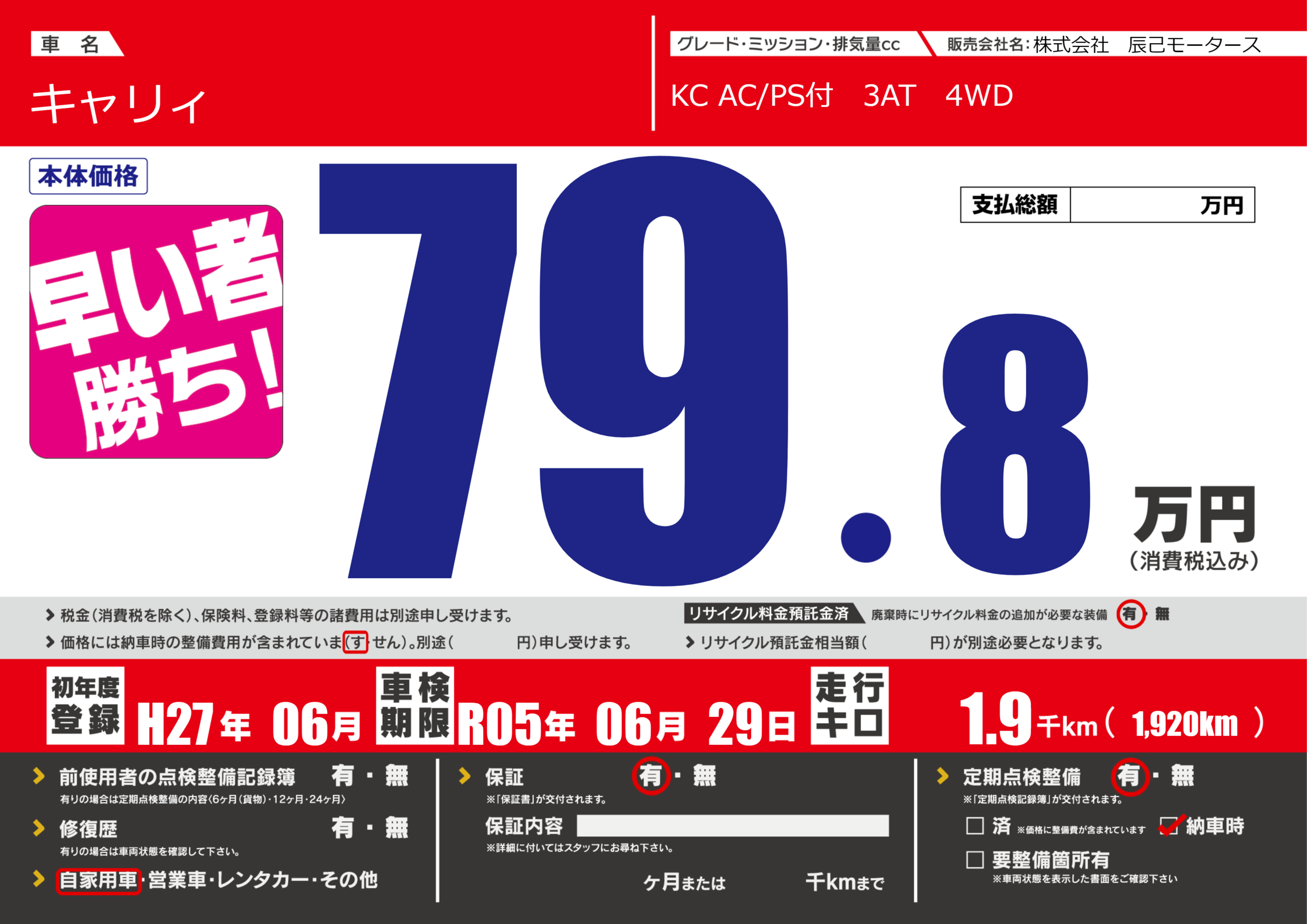 | 定期点検整備 | 定期点検整備あり 納車時あり | ||
