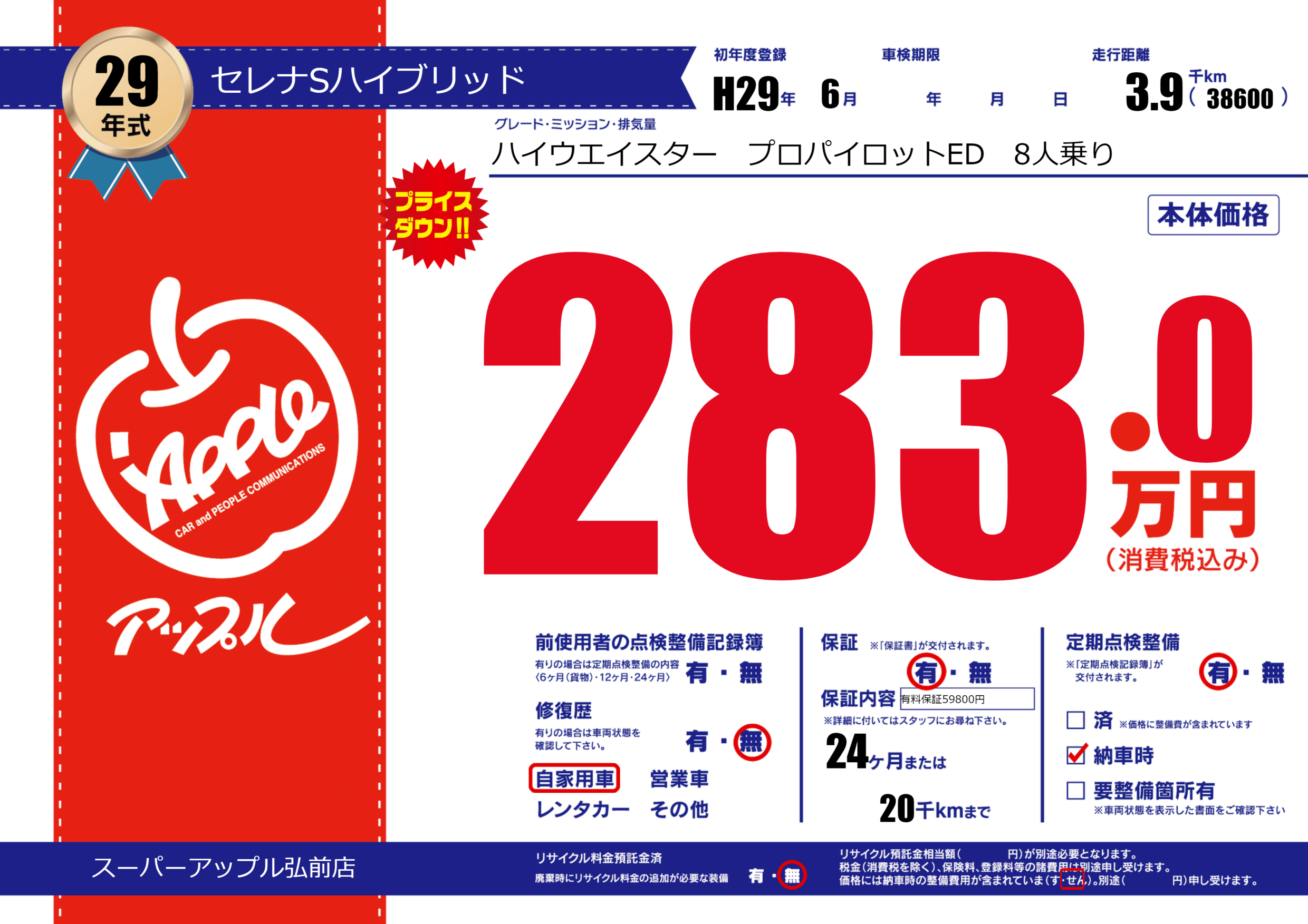 | 走行キロ | 0.3万km | 初年度登録 | H29年6月 |