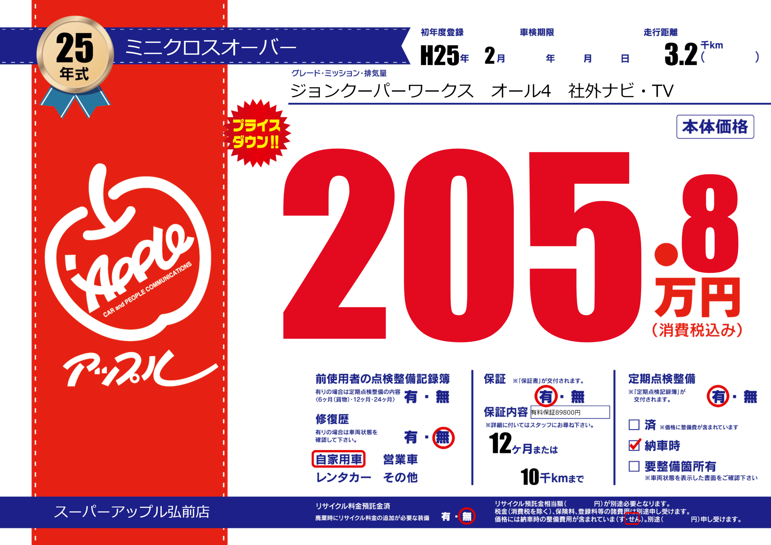 | 走行キロ | 0.3万km | 初年度登録 | H25年2月 |