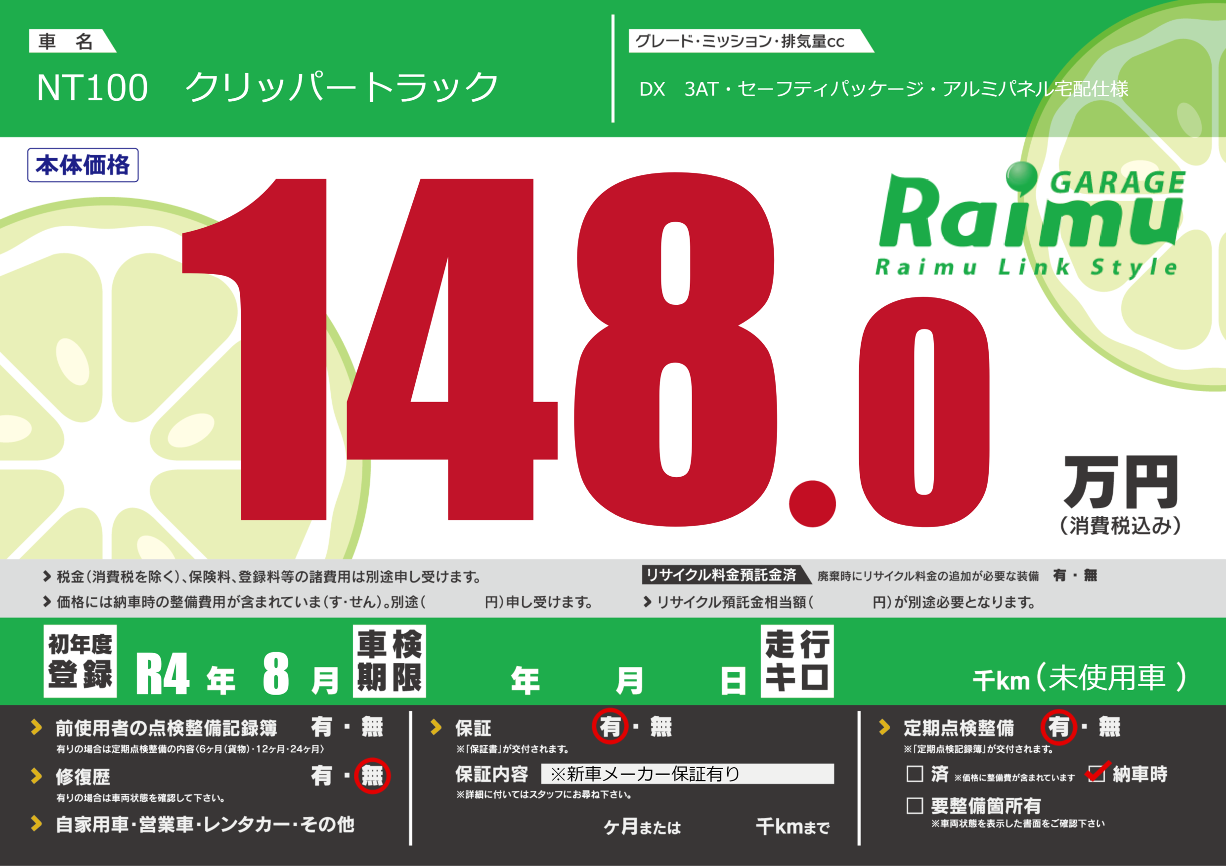 | 車名 | NT100 クリッパートラック | グレード ミッション 排気量 |