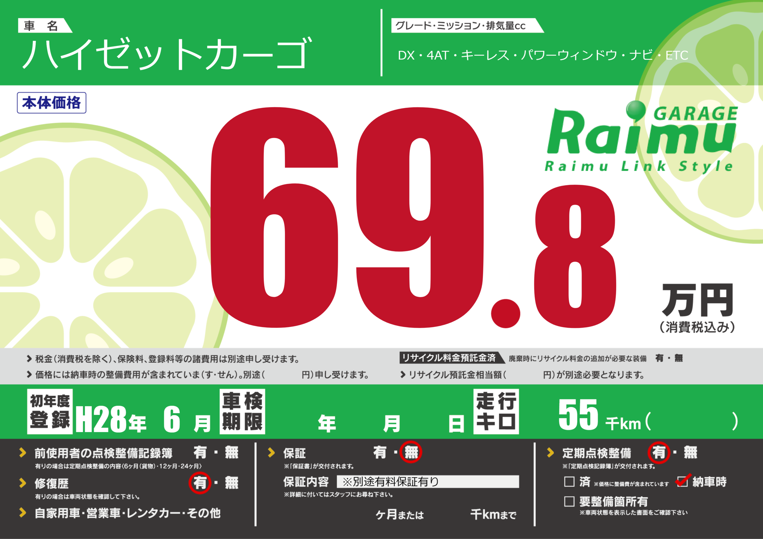 | 車名 | ハイゼットカーゴ | グレード ミッション 排気量 |