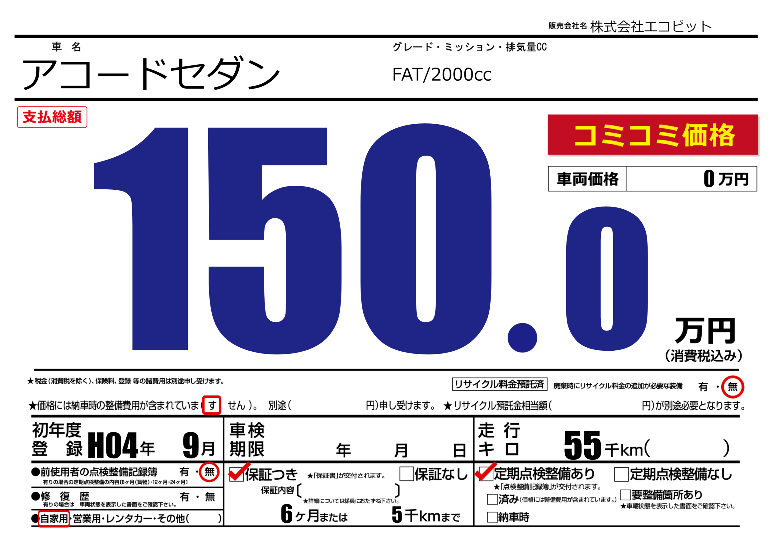 保証付き 保証内容(---) 6ヶ月または(5)千kmまで |