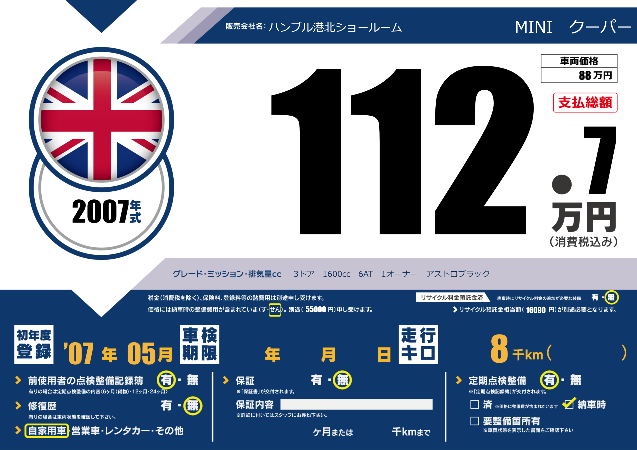 | 車名 | MINI クーパー | グレード ミッション 排気量 |