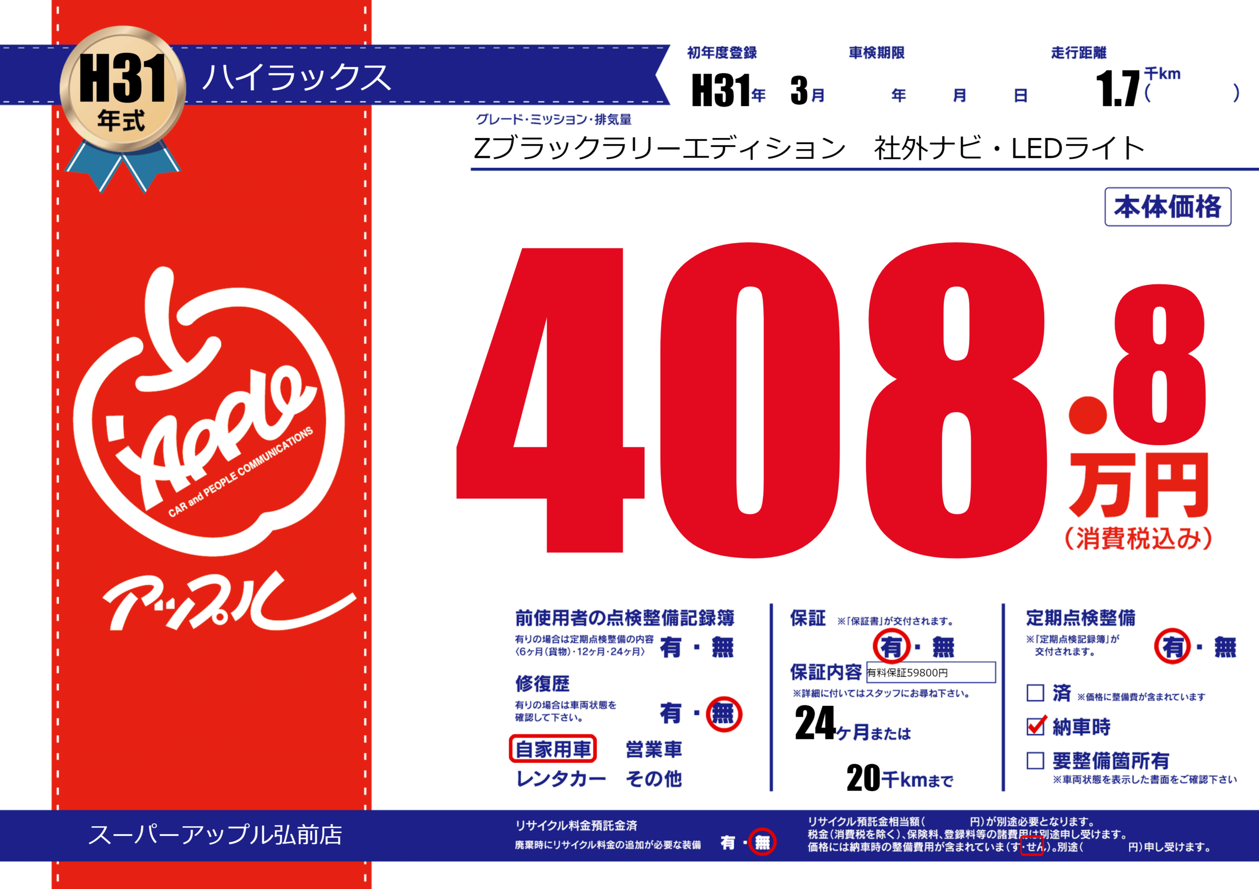 | 走行キロ | 0.1万km | 初年度登録 | H31年3月 |