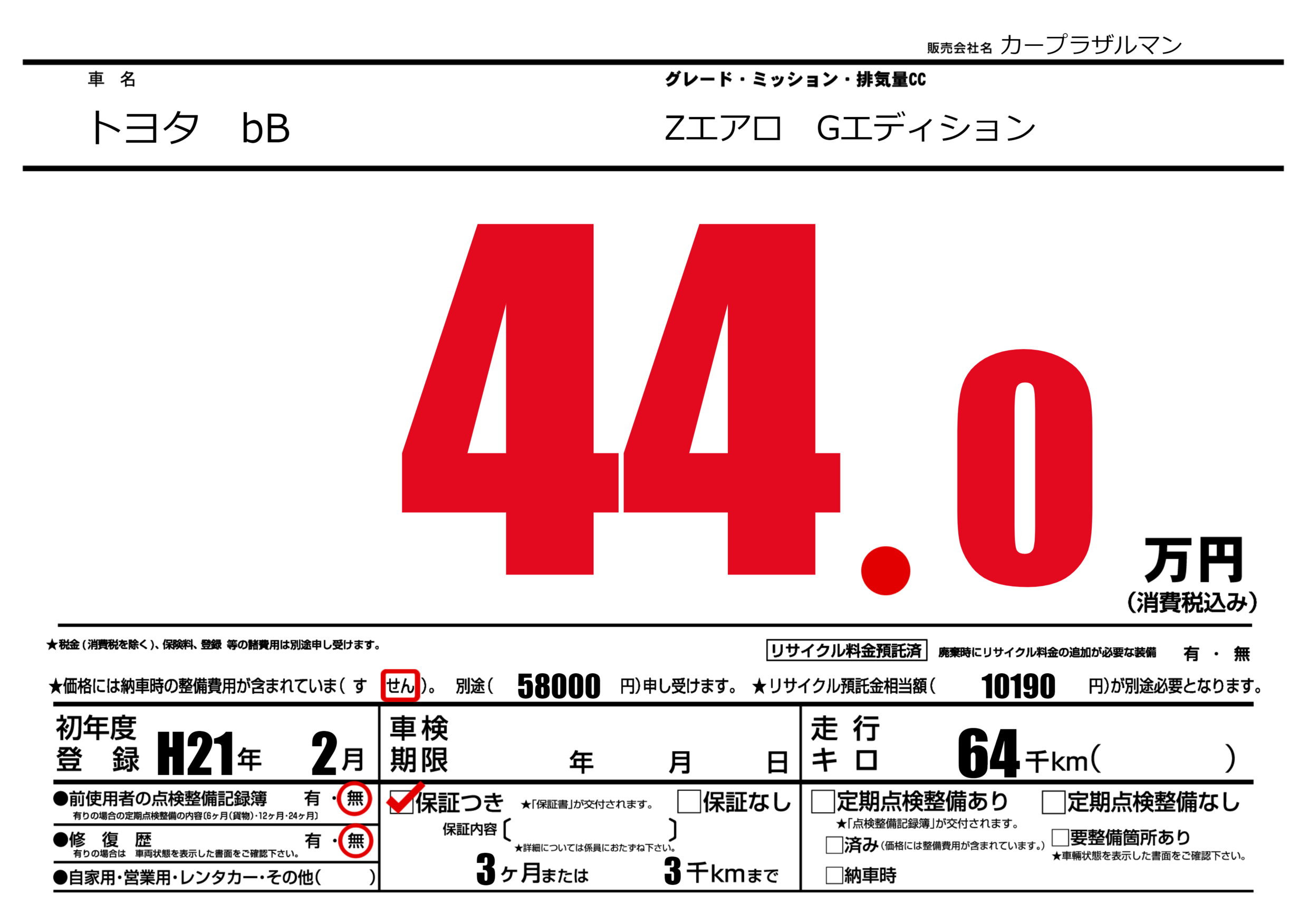 保証付き 保証内容(---) 3ヶ月または(3)千kmまで |