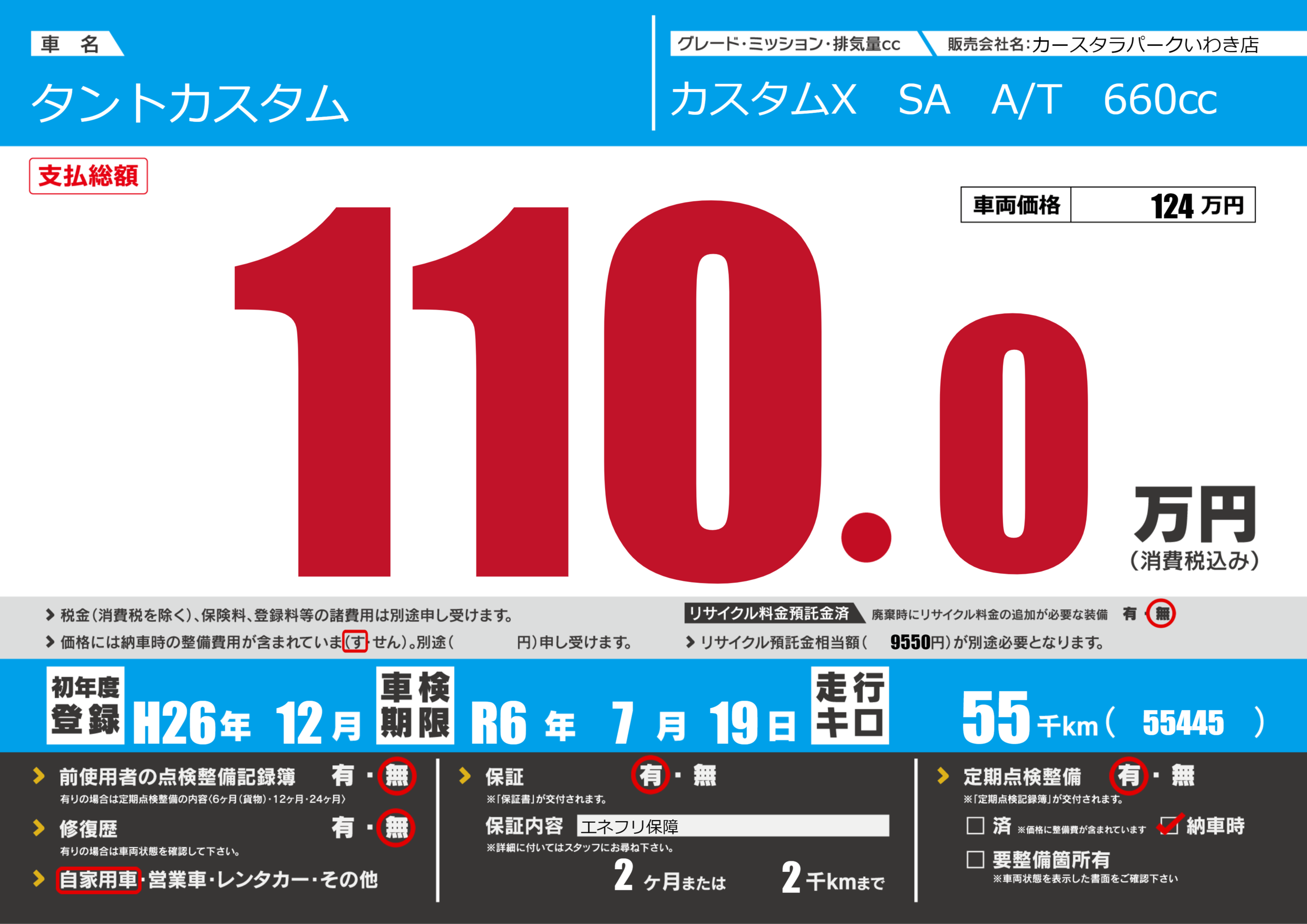 保証付き 保証内容(エネフリ保障) 2ヶ月または(2)千kmまで |