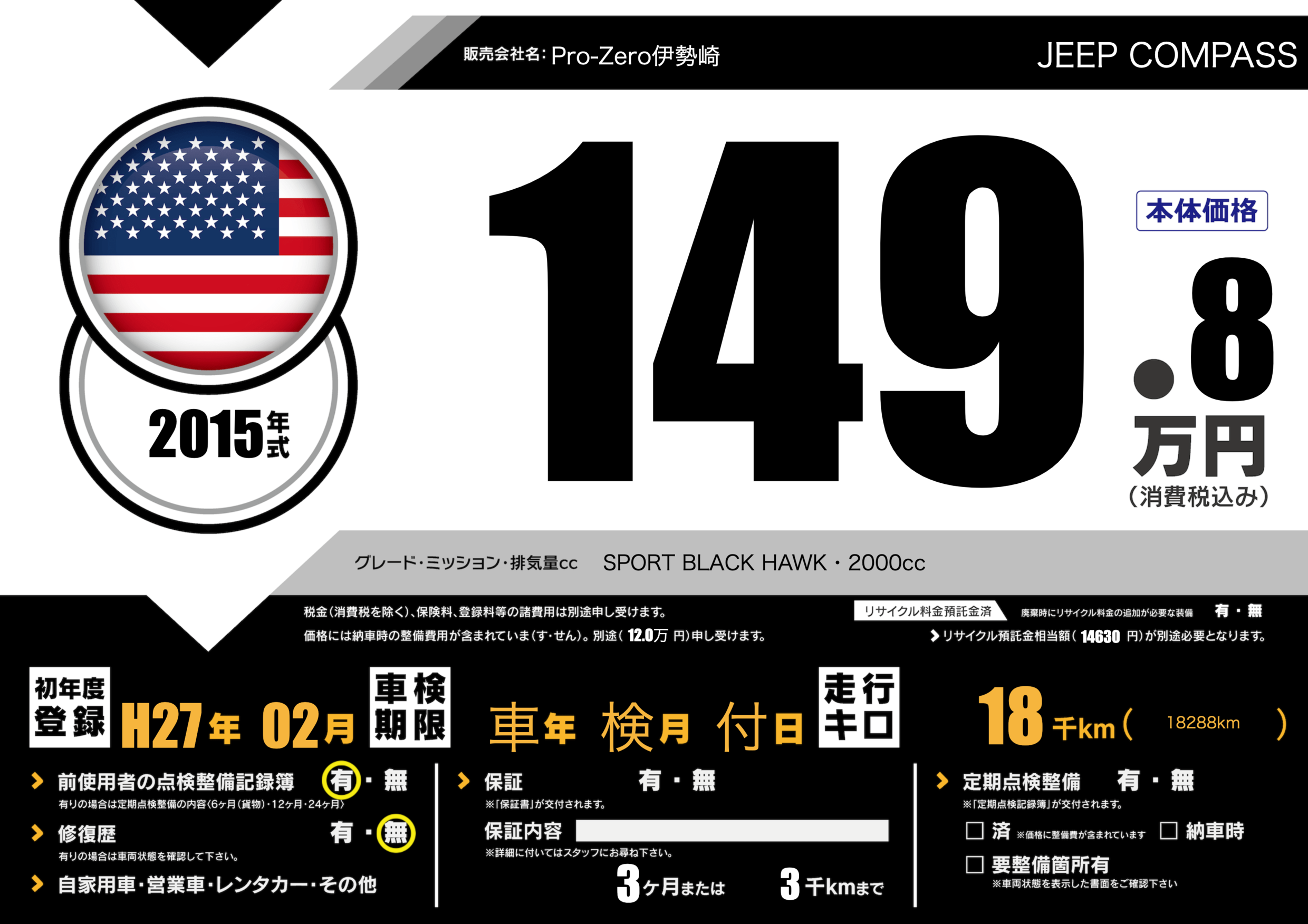 | 車名 | JEEP COMPASS | グレード ミッション 排気量 |