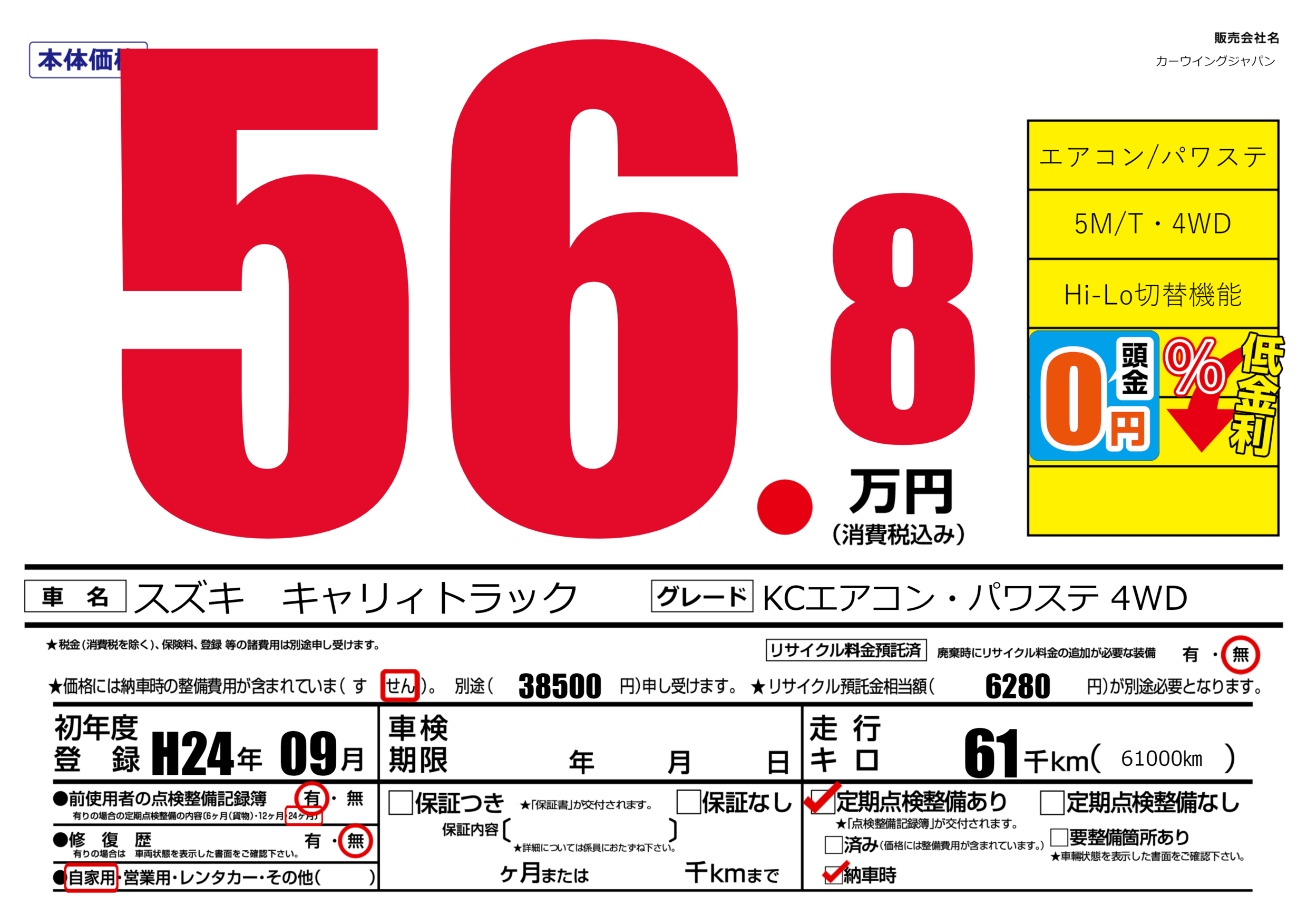 | 車名 | スズキ キャリィトラック | グレード ミッション 排気量 |